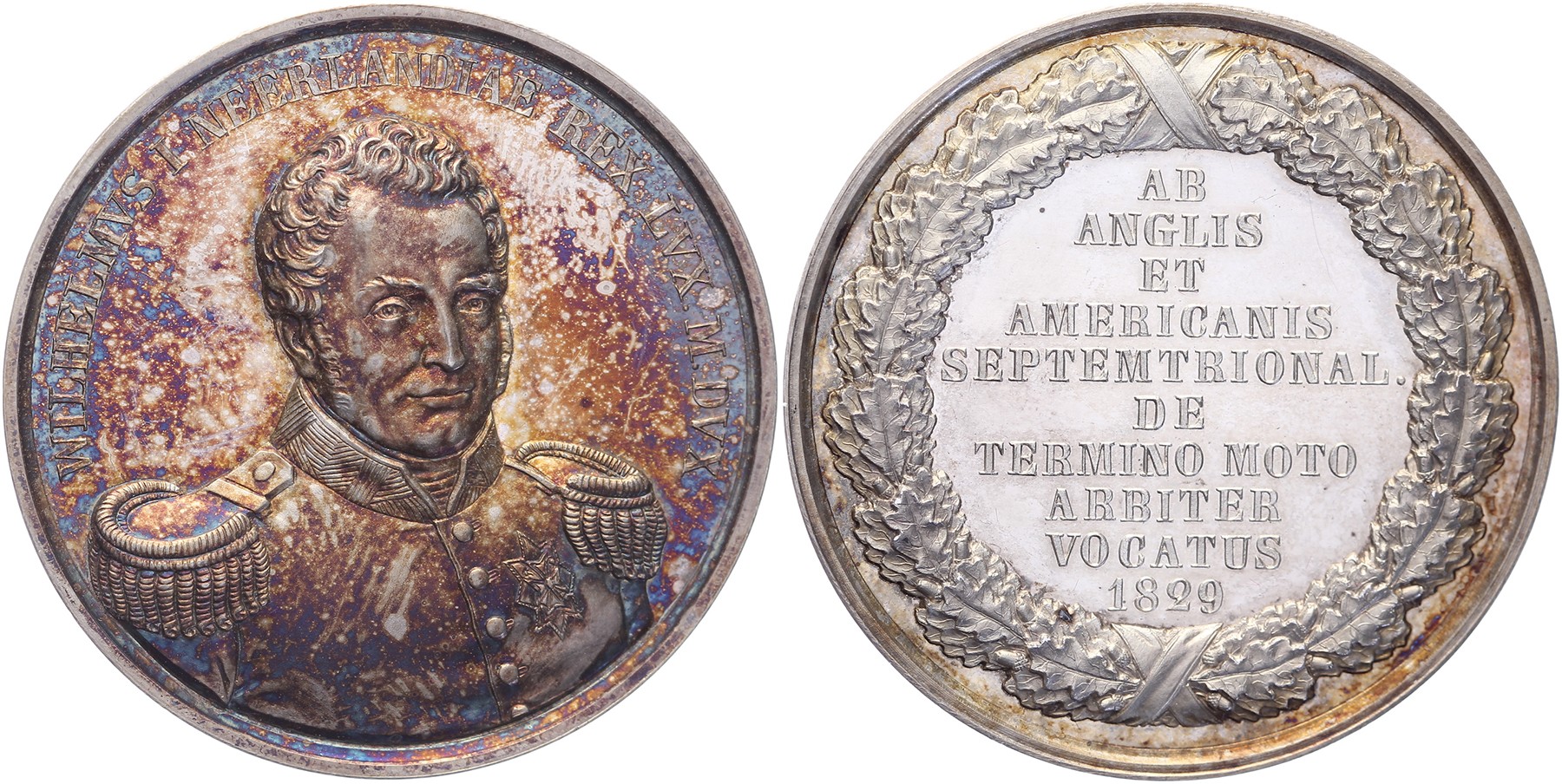 1829 Willem I bemiddelt in de territoriale geschillen tussen de Engelsen en de Amerikanen. Borstbeeld Willem I in uniform. Omschrift: WILHELMVS I NEERLANDIAE REX LVX.M.DVX. / Tienregelige tekst. AR 40 [28,64 gram]. Dirks 310. Zeldzaam (R). Prachtig. - Aangekocht bij Munthandel Verschoor, januari 2000.