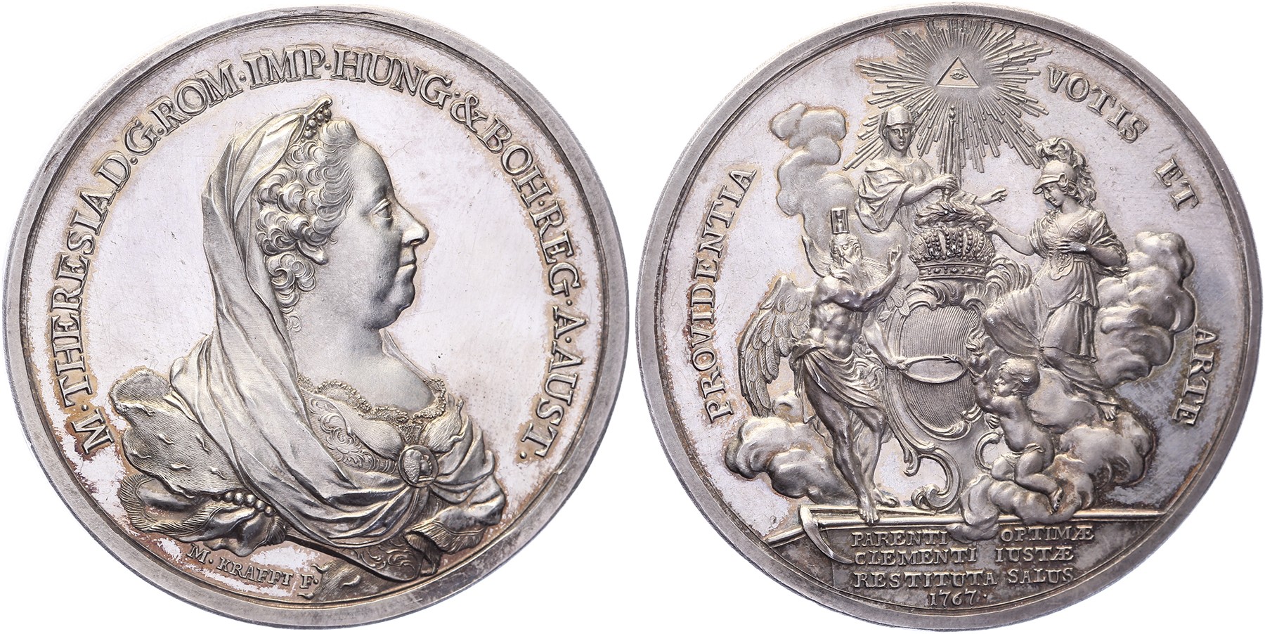 1767 Genesung der Kaiserin von den Pocken. Brustbild mit Witwenschleier nach rechts. / Saturn mit Schlangenkreis, Providentia mit Zepter, Minerva mit Lorbeerkranz und Putto mit brennendem Herzen umgeben den gekrönten Bindenschild. AR 57 [61 gram]. Slg. Montenuevo 1975; SDMT 198; HMA Stempelslg. 1303/1304. M. Krafft. Prachtexemplar. Vorzüglich / Stempelglanz. - Purchased from Künker, June 2012, auction 211, lot 2694.