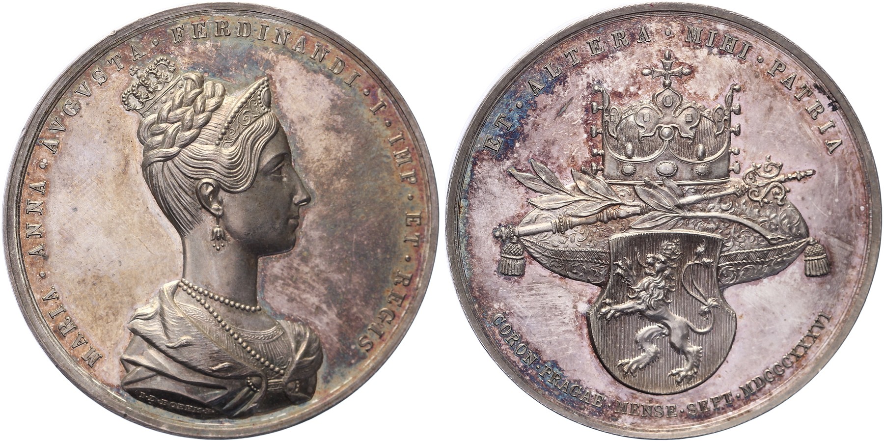 1836 Krönung Maria Anna Augusta von Böhmen zu Prag & Ferdinand I. Brustbild Maria nach rechts. / Krone auf Kissen mit böhmischen Wappen.AR 46,8 [43,91 gr.]. Julius II-3213; Mont. 2557. I. D. Boehm. Vorzüglich.