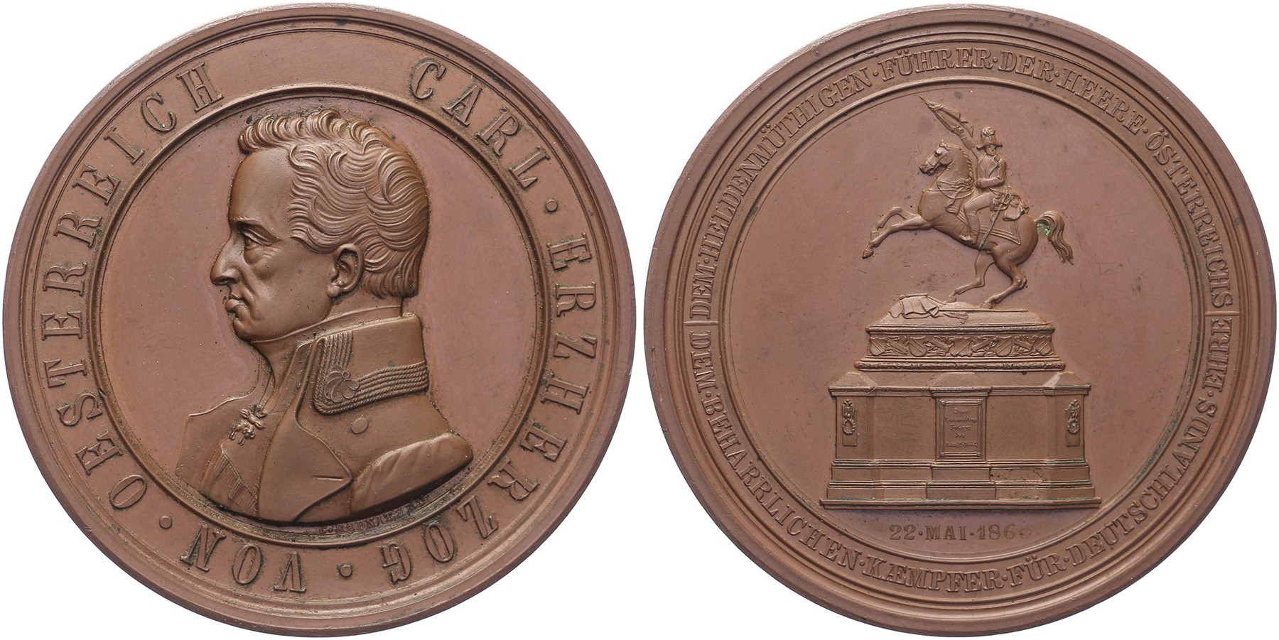 1860 Wien. Auf die Enthüllung Reiterdenkmal Erzherzog Karl. Uniformiertes Brustbild nach links. / Ansicht des Denkmal. Æ 64. Hauser 2220; Wurzb. 4455. Radnitzky. Vorzüglich.