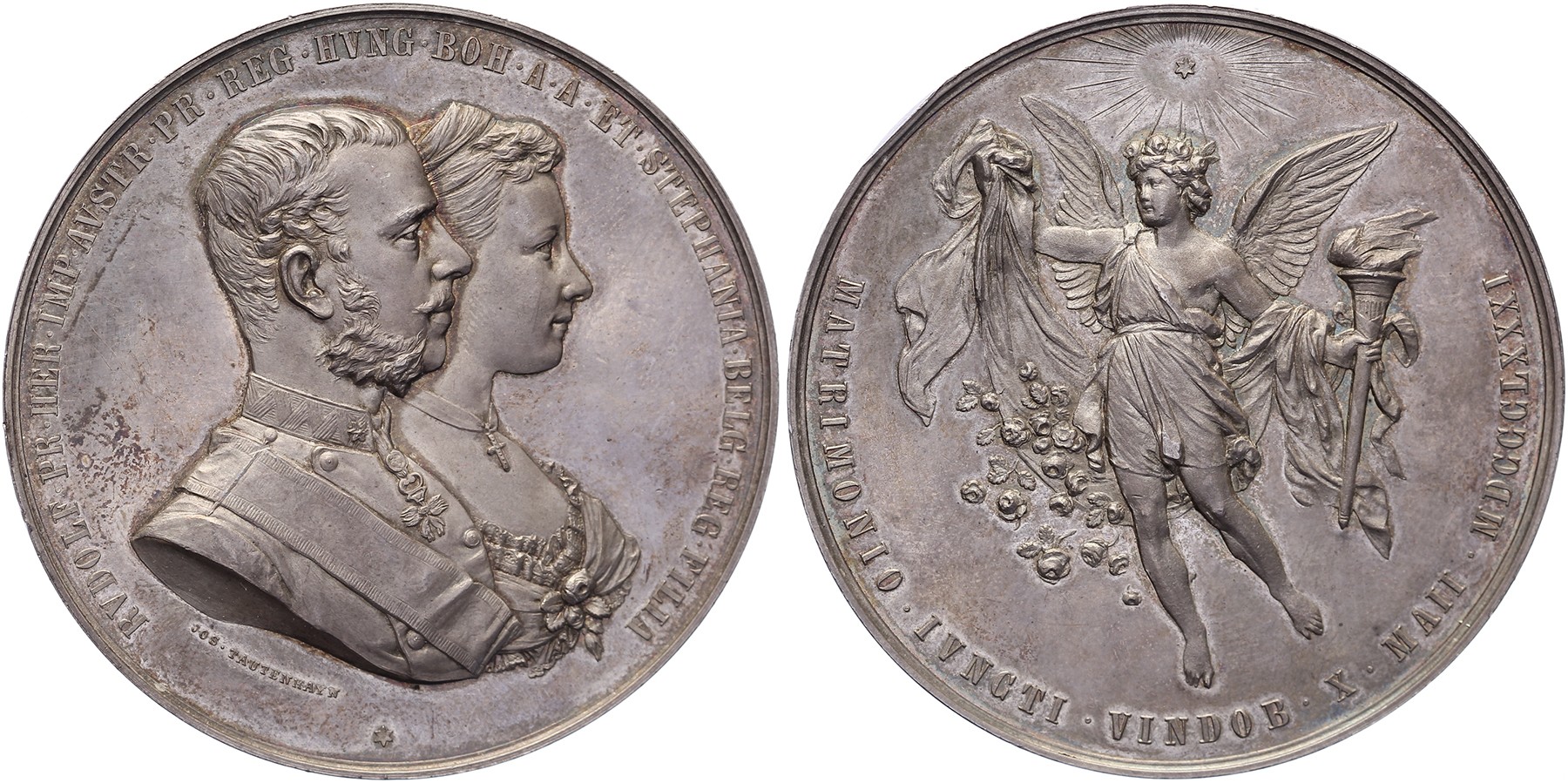 1881 Auf die Hochzeit in Wien von Kronprinz Rudolf und Stefanie. Gestaffelte Brustbilder nach rechts. / Engel mit Fackel und Tuch aus dem Rosen fallen.AR 55 [81,97 gram]. Wurzbach 8055 (Æ); Hauser 372 (Æ); Donebauer 3252; Horsky 4002. J.H. Tautenhayn. Leichte Randfehler. Vorzüglich.