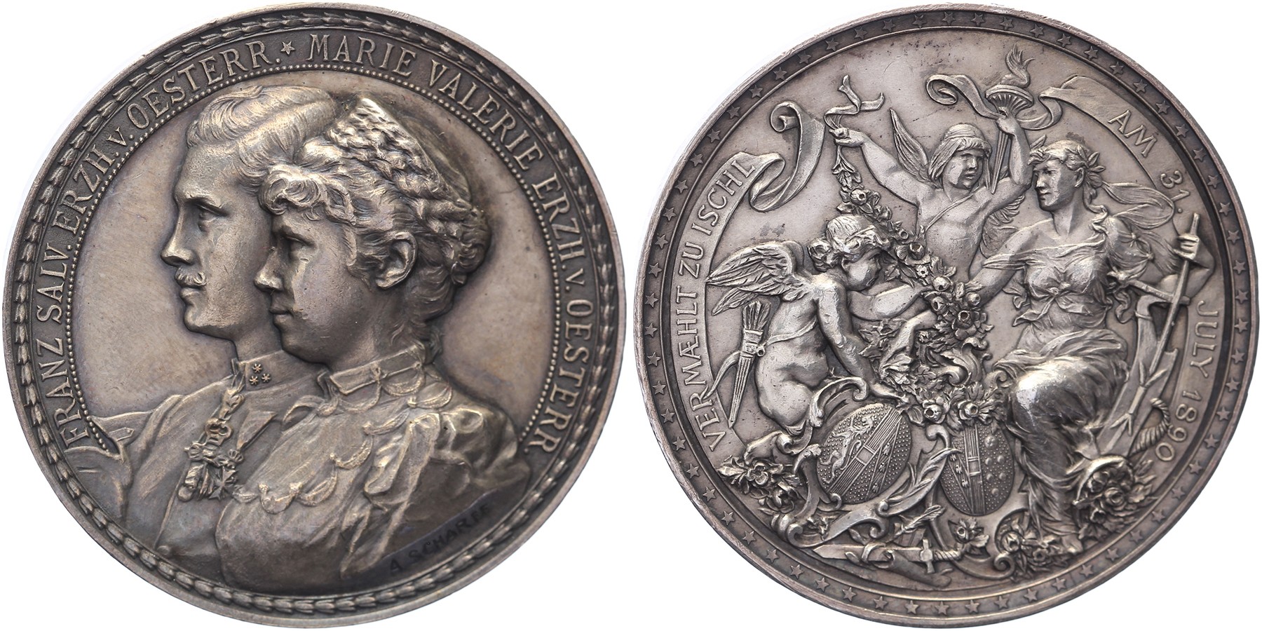 1890 Vermählung Franz Salvator und Marie Valerie in Ischl. Gestaffelte Brustbilder nach links. / Amor, Fortuna und Hymen schmücken die Wappen des Paares.AR 44 [39,51 gram]. A. Scharff. Vorzüglich.