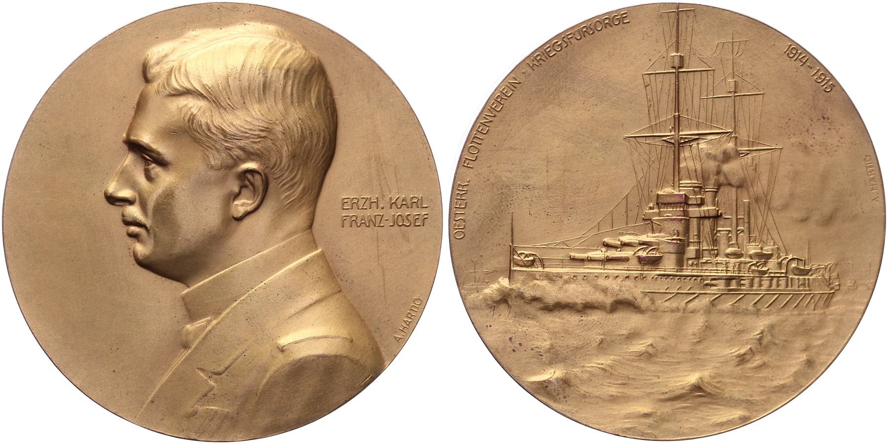 1915 Auf den österreichischen Flottenverein und die Kriegsfürsorge. Brustbild Erzherzog Karl I nach links. / Kriegsschiff ‘Tegetthoff’. Æ 60. Wurzbach 4294. A. Hartig. Vorzüglich.