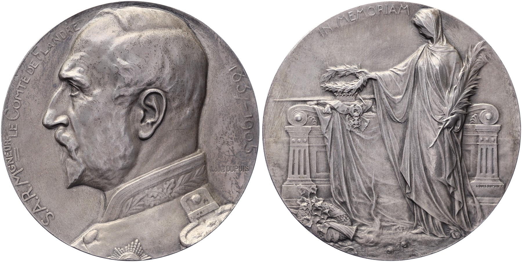 1905 De Graaf van Vlaanderen. Borstbeeld van de graaf in uniform naar links. / Gesluierde rouwende vrouw bij het graf van de graaf. AR 64,5 [87,55 gram]. Louis Dupuis. EF.