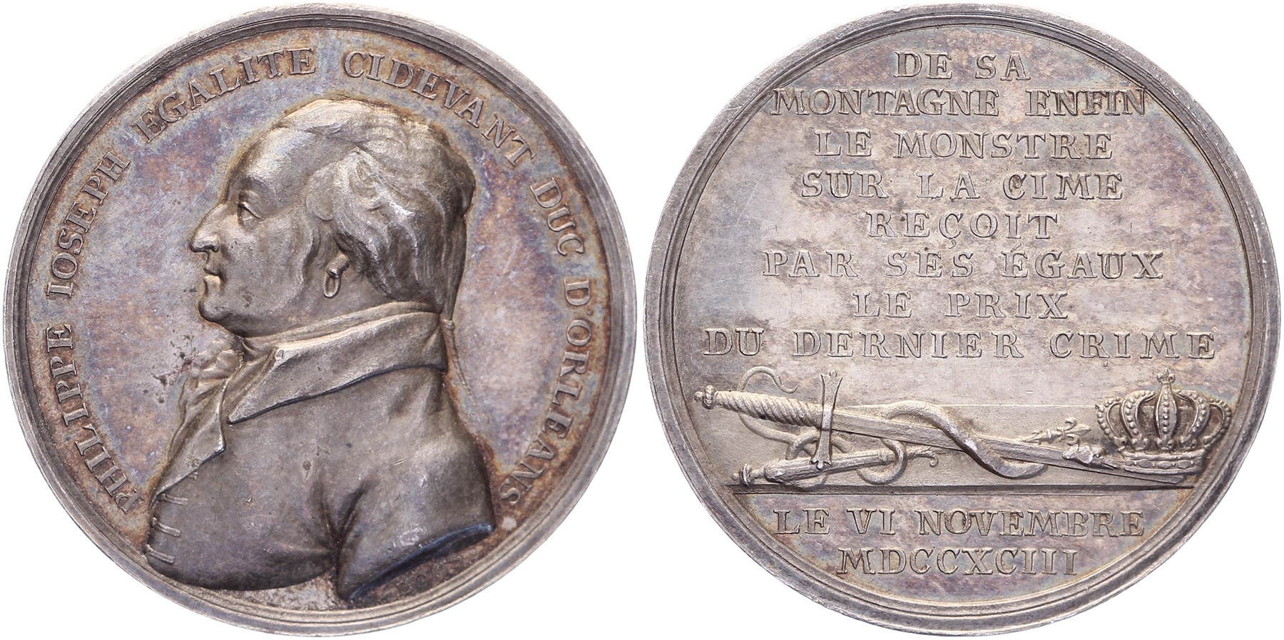 1793 On the execution of Louis Philippe Joseph d’Orléans. Half-length portrait to left. Legend: PHILIPPE IOSEPH EGALITÉ CIDEVANT DUC D’ORLÉANS. / Ten lines of writing, subdivided by insignia of rulership wrapped in a snake. AR 30. Hennin 550. Loos. Rare. EF. - Purchased from Jean Elsen, April 1993, auction 29, lot 1365.