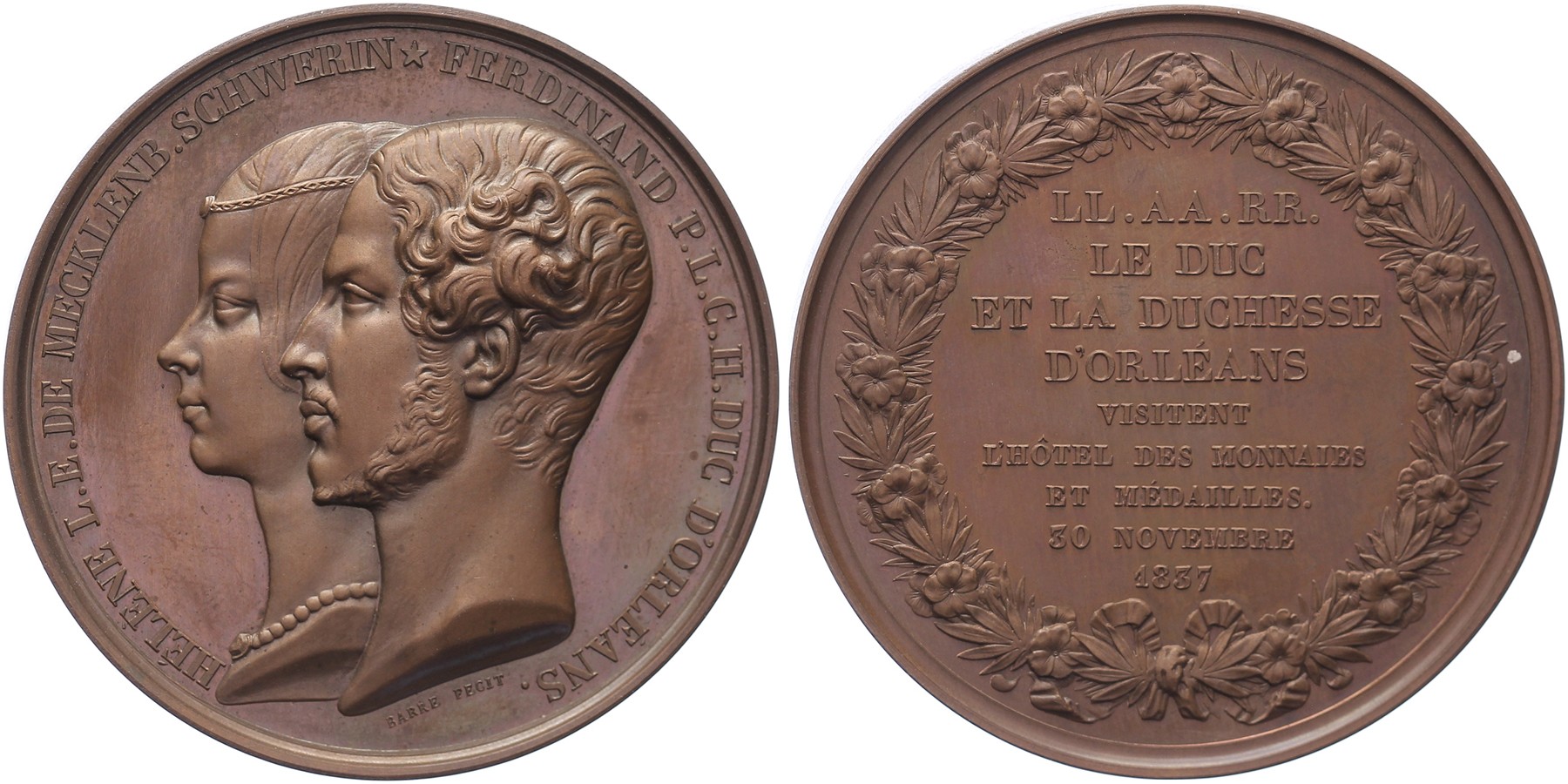 1836 Visit of Helene de Mecklenburg & Ferdinand duc d’Orleans to the Coin and Medal hotel.Conjoined busts left. / Nine lines of text. Æ 51. Coll. 1136. Barre. EF. - Purchased from Laurens Schulman BV, November 2004, auction 30, lot 2281.