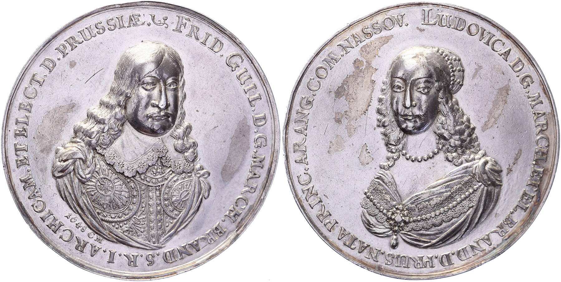 1648 Silbermedaille von C. Melchior und J. Höhn. Geharnischtes Brustbild Friedrich Wilhelms mit Spitzenkragen und Feldbinde fast v.v. / Brustbild der Kurfürstin Luise Henriette von Nassau-Oranien met großem Perlenschmuck fast v.v. AR 57 [60 gram]. Brockmann 195. Kleine Randfehler. RR. Sehr schön. - Purchased from Künker, March 2013 auction 228, lot 4141.