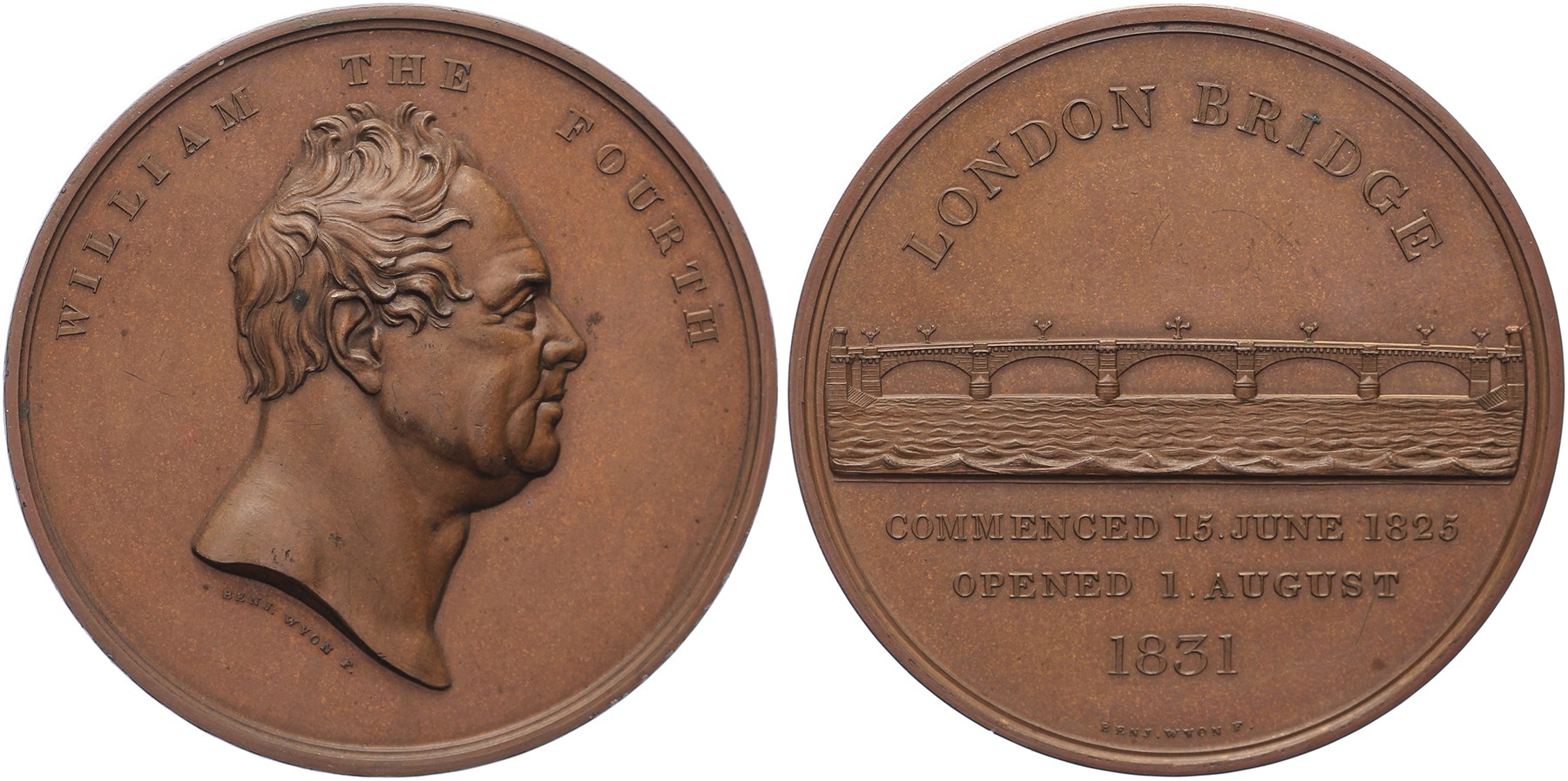 1831 Opening London Bridge by William IV. Head of William IV right. / View of the bridge. Æ 51,5. Eimer 1245; BHM 1544. B. Wyon. EF. - Purchased from Schulman BV, April 2009, auction 331, lot 953.