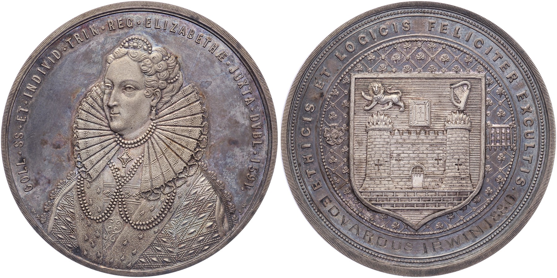 n.d. (± 1850) Dublin. Trinity College, the Queen Elizabeth prize medal. Half-length bust of Elizabeth I. / Large heraldic shield. Awarded to Edvardus Irwin 1880.AR 52 [62,41 g.]. Eimer 1453a. W. Woodhouse. In original box. Dark toned. EF. - Purchased from Karel de Geus Muntveilingen, auction 4, lot 1388.