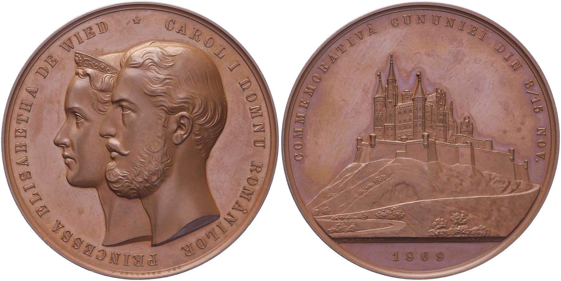 1869 Marriage of Carol I and Elisabeth of Wied. Raised heads of the bride and groom / Hohenzollern Castle. Æ 50,8. Sommer K. 65. W. Kullrich. EF / UNC. - Purchased from Künker, October 2007, auction 131, lot 4384.