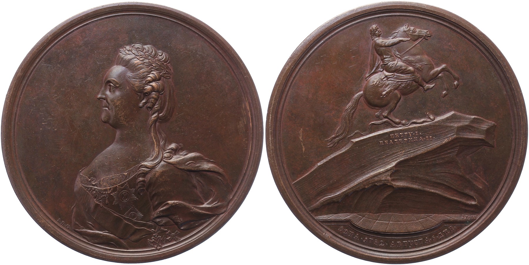 1782 Opening of the Peter I Monument in St. Petersburg. Laureate bust of Catherine II left. / View of the Peter I monument.Æ 82. Diakov-194.2; Smirnov-291. J.B. Gass and J.G. Waechter. - Purchased from Jean Elsen, September 2009, auction 102, lot 1956.