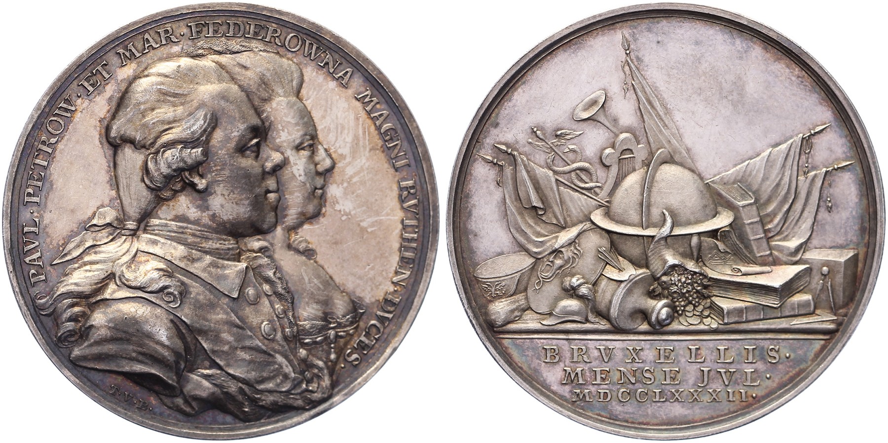 1782 Visit of Paul I of Russia to Bruxelles. Conjoined busts of Crown Prince Paul and his wife Maria Feodorovna right. / Globe surrounded by symbols of war and learning.AR [27,04 gram]. DPR IV-1916; de W. 94. Th. v. Berckel. EF. - Purchased from Laurens Schulman BV, April 1996, auction 16, lot 1515.