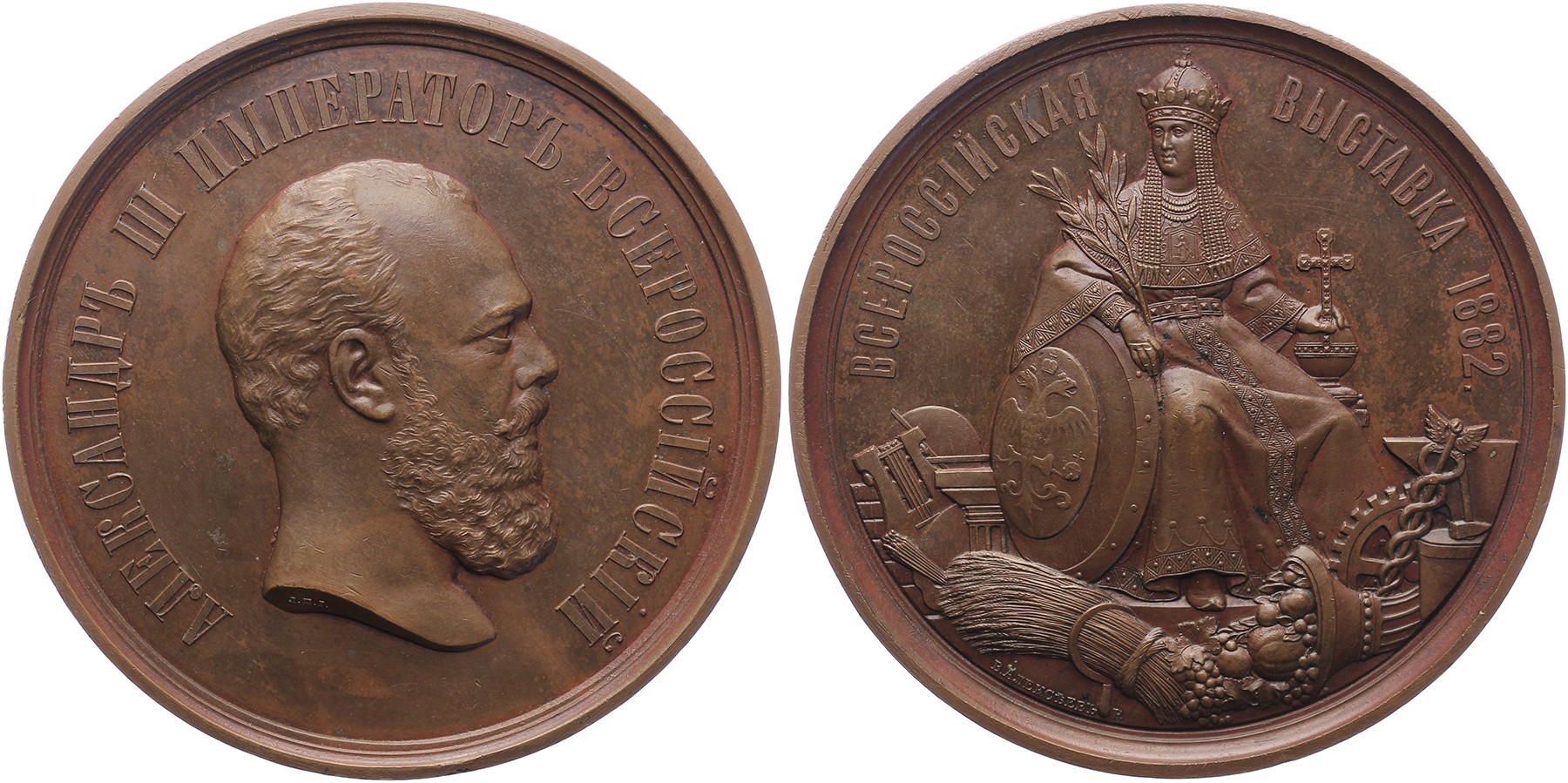1882 Exposition in Moscow. Bearded Alexander III head right. / Mother Russia in medieval crown and robes with emblems of agriculture, industry and arts. Æ 93,4. Diakov 930.1, Smirnov 860/a. L. Steinman & V. Alexeev. Rare (RR). Small edge imperfection. EF. - Purchased from Künker, October 2013, auction 239, lot 7266.