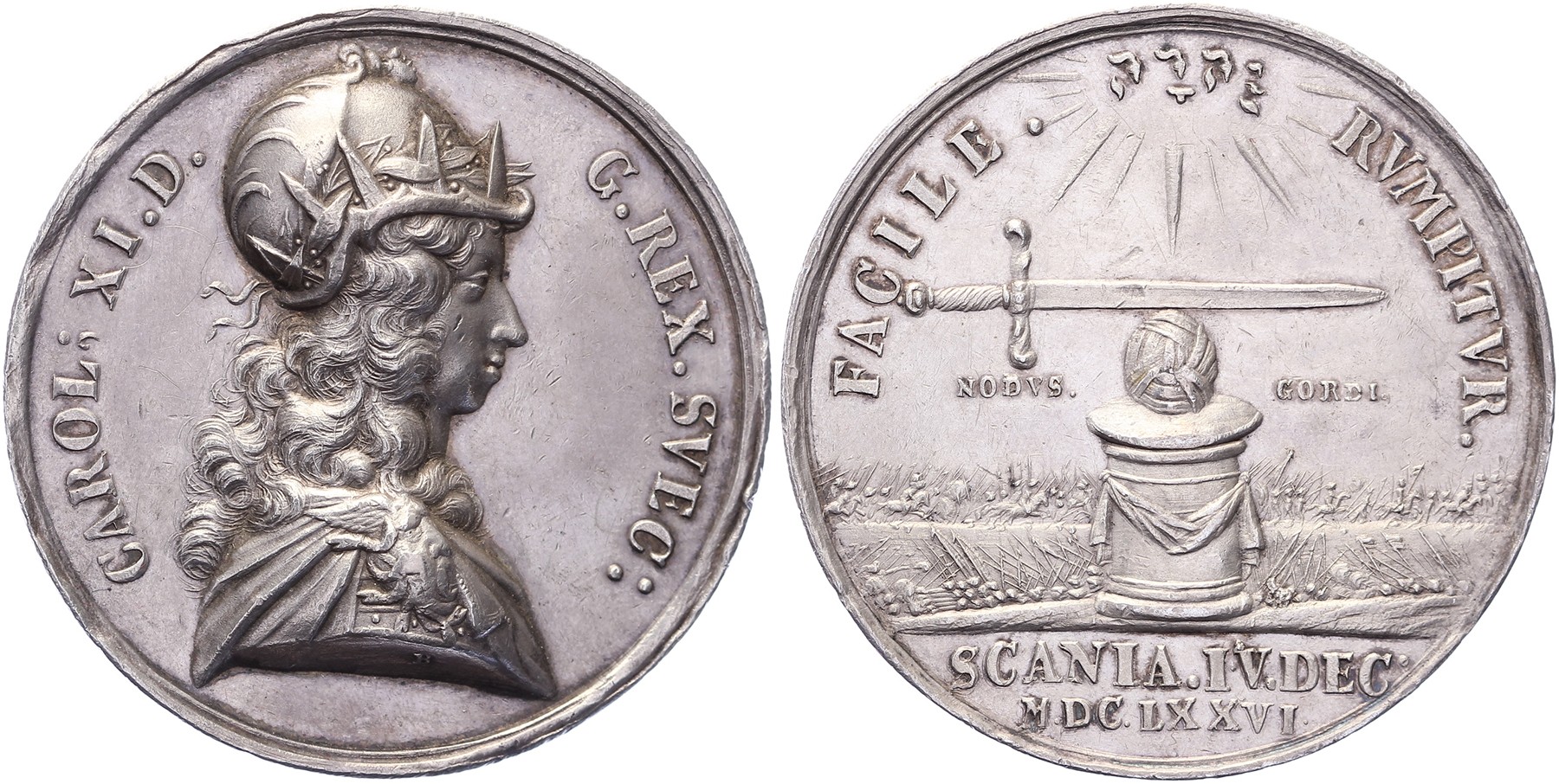 1676 Victory at Lund. Bust of king facing right. Legend: CAROL; XI.D. G. REX. SVEC: / Round altar on which the Gordian knot. With Historical background. Legend: FACILE. RVMPITVR. AR 55,2 [57,67 gram]. Hildebrand I-409. J.G. Breuer. Some edge imperfections. Rare (RR). VF / EF. - Purchased from Künker, September 2011, auction 194, lot 2624.