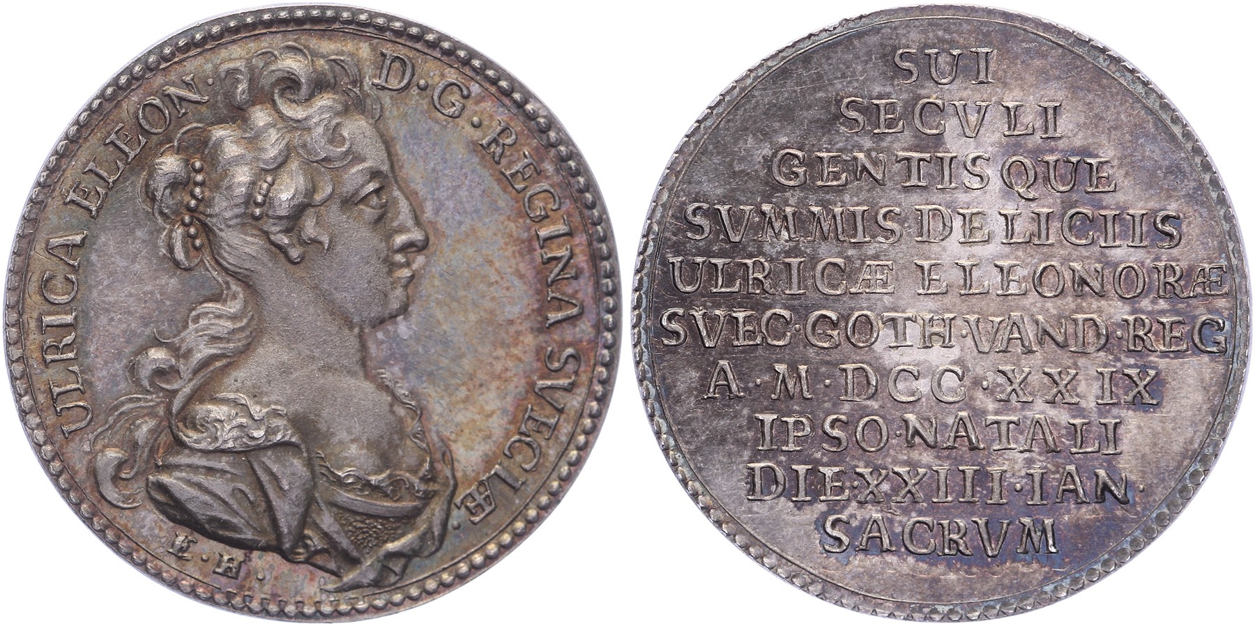 1729 Birthday Ulrika Eleonara. Bust of Ulrika Eleonora with folded coat right. Legend: ULRICA ELEON D.G. REGINA SVECIÆ. / 10 lines of font.AR. 31 [10,75 gram]. Hildebrand 2. E. Hartman. Nice colour of toning. EF. - Purchased from Künker, September 2009, auction 159, lot 2184.
