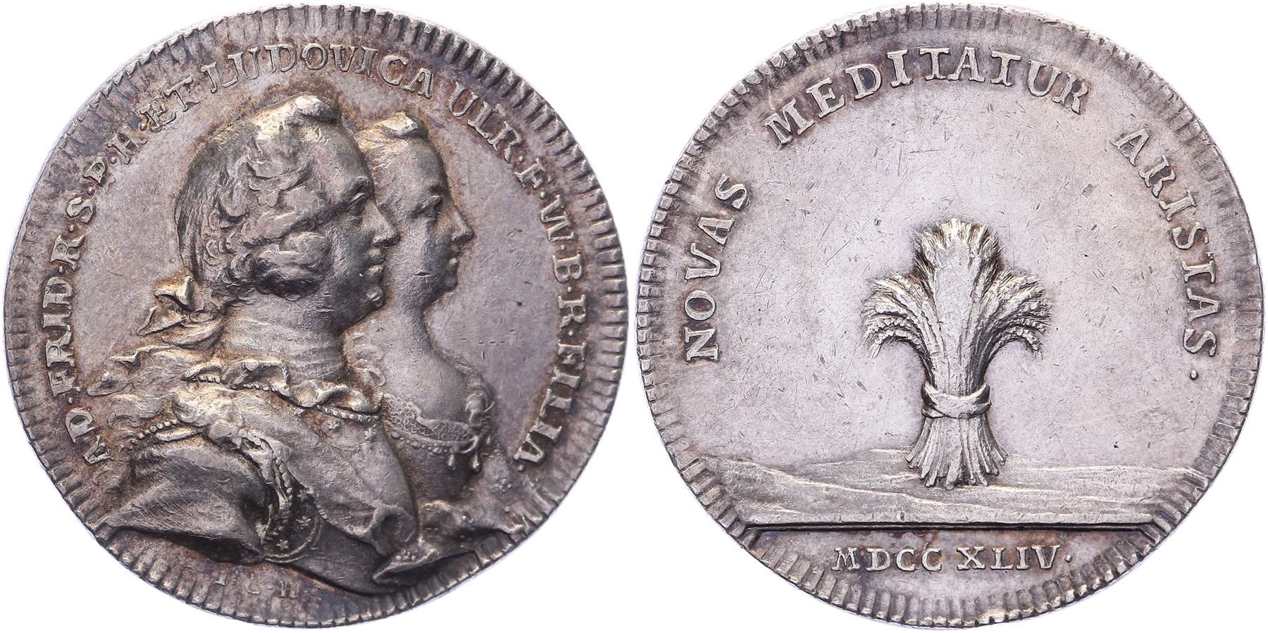 1744 Marriage of Adolf Frederik with Louise Ulrika of Prussia. Busts of Adolf Frederik and Louise right. / Vasa coat of arms. AR 33 [16,36 gram]. Felder 171. J.C. Hedlinger. EF. - Purchased from Jean Elsen, April 2004, auction 79, lot 191.