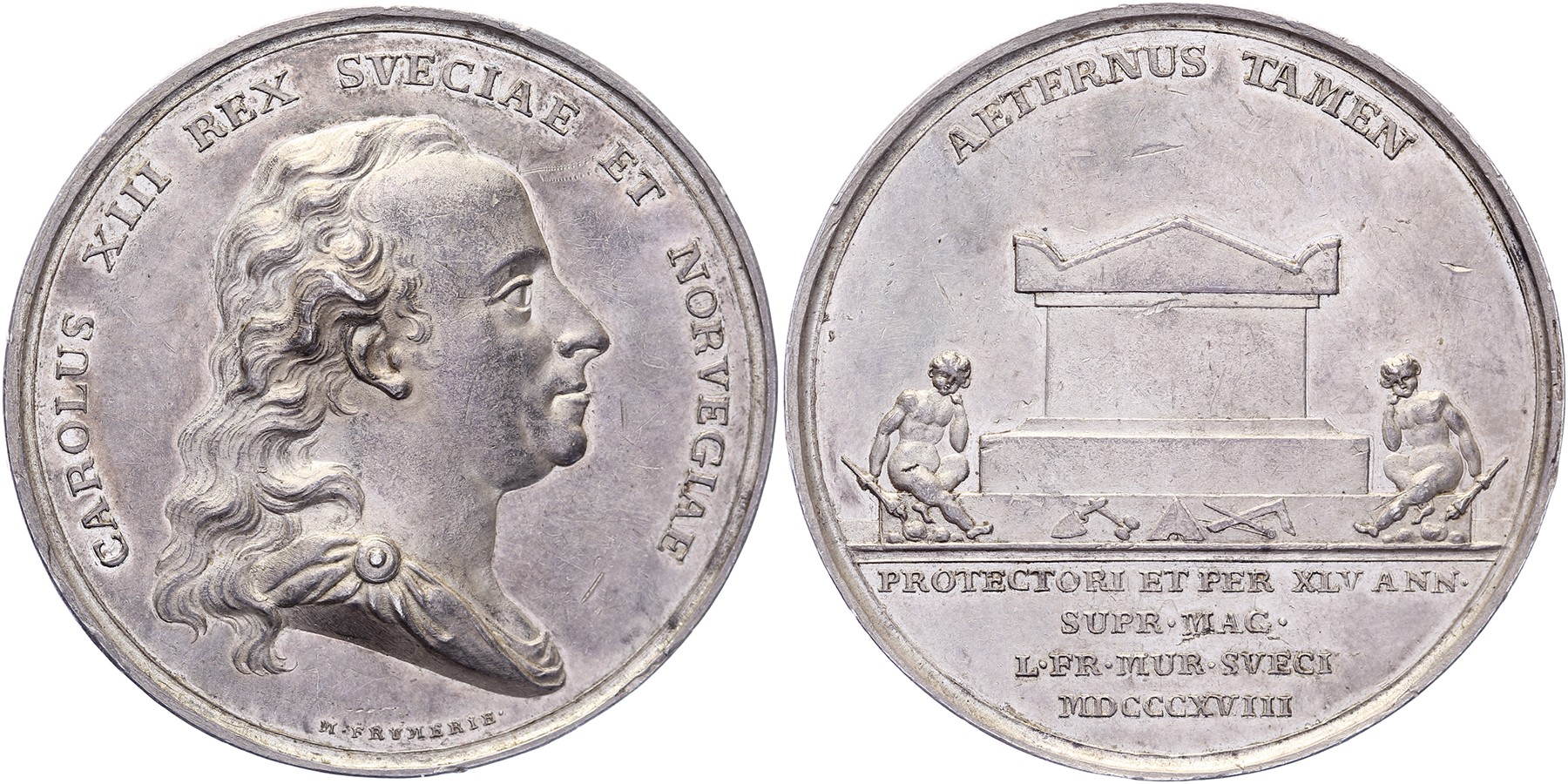1818 Death and burial of Carl XIII. Bust right. / Sarcophagus with on both sides Genius with torch. AR 55,24 [52 gram]. Hildebrand II, S. 291, 24. M. Frumerie. Scratches. VF / EF. - Purchased from Künker, September 2009, auction 159, lot 2196 .