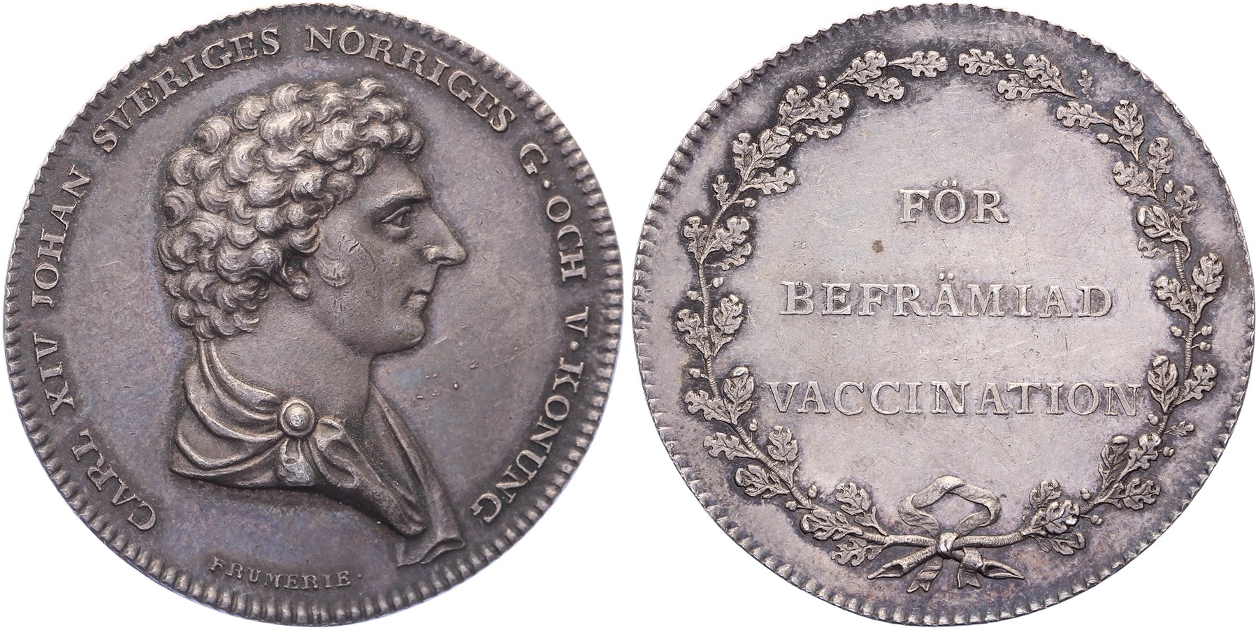 n.d. (1818-1844) Charles XIV Johan - For the promotion of vaccination. Bust of Charles XIV right. / För Befrämjad Vaccination. AR 38 [19,4 gram]. Hildebrand 80; Forrer 2. M. Frumerie. VF. - Purchased from Jean Elsen, December 1998, auction 56, lot 3266.