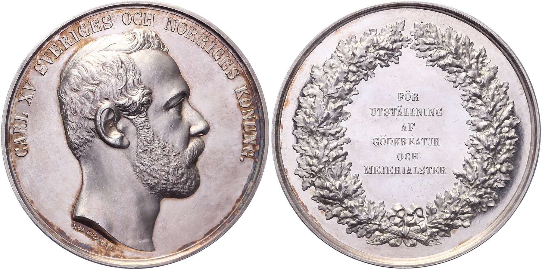 n.d. Exhibition of Dairy Cattle and Dairy Products (Carl XV 1859-1872). Bust of Carl to right. / Six lines of writing within oak wreath. AR 57,61 [92,79 gram]. Hildebrand II, s. 477, 49. Lea Ahlborn. EF. - Purchased from Künker, October 2012, auction 217, lot 3044.