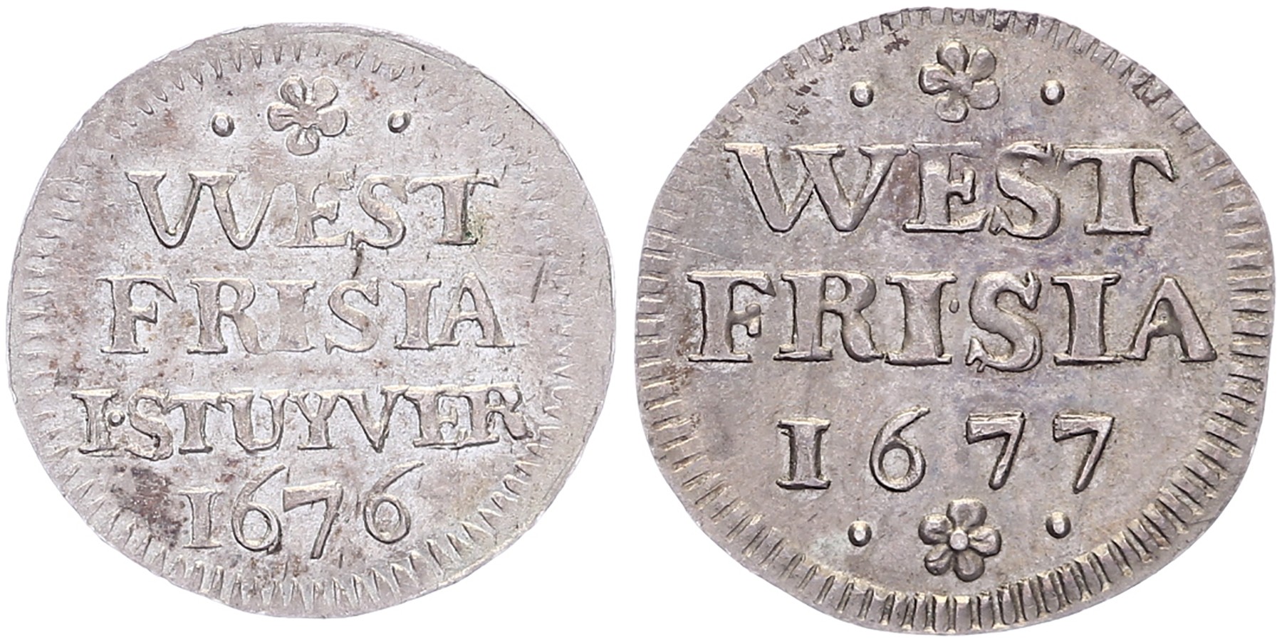 Lot (2) 1 Stuiver 1676 B.P. en 1 Stuiver 1677. CNM 2.15.17, 2.15.18; HPM 90. Zeer fraai.