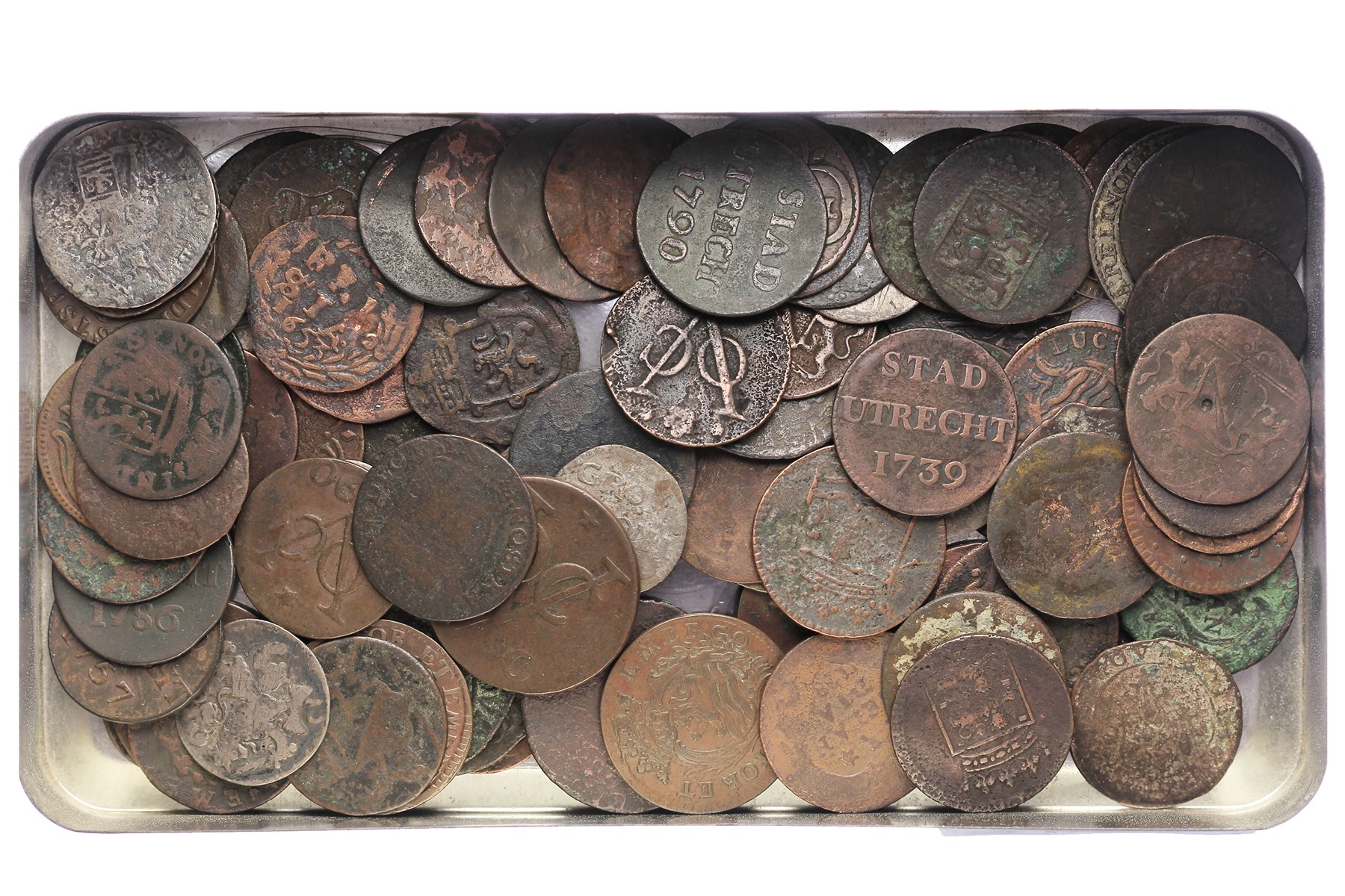 Blikje met provinciaal allerlei. Ca. 100 stuks, o.a. duiten en dubbele wapenstuivers. Matige kwaliteit.