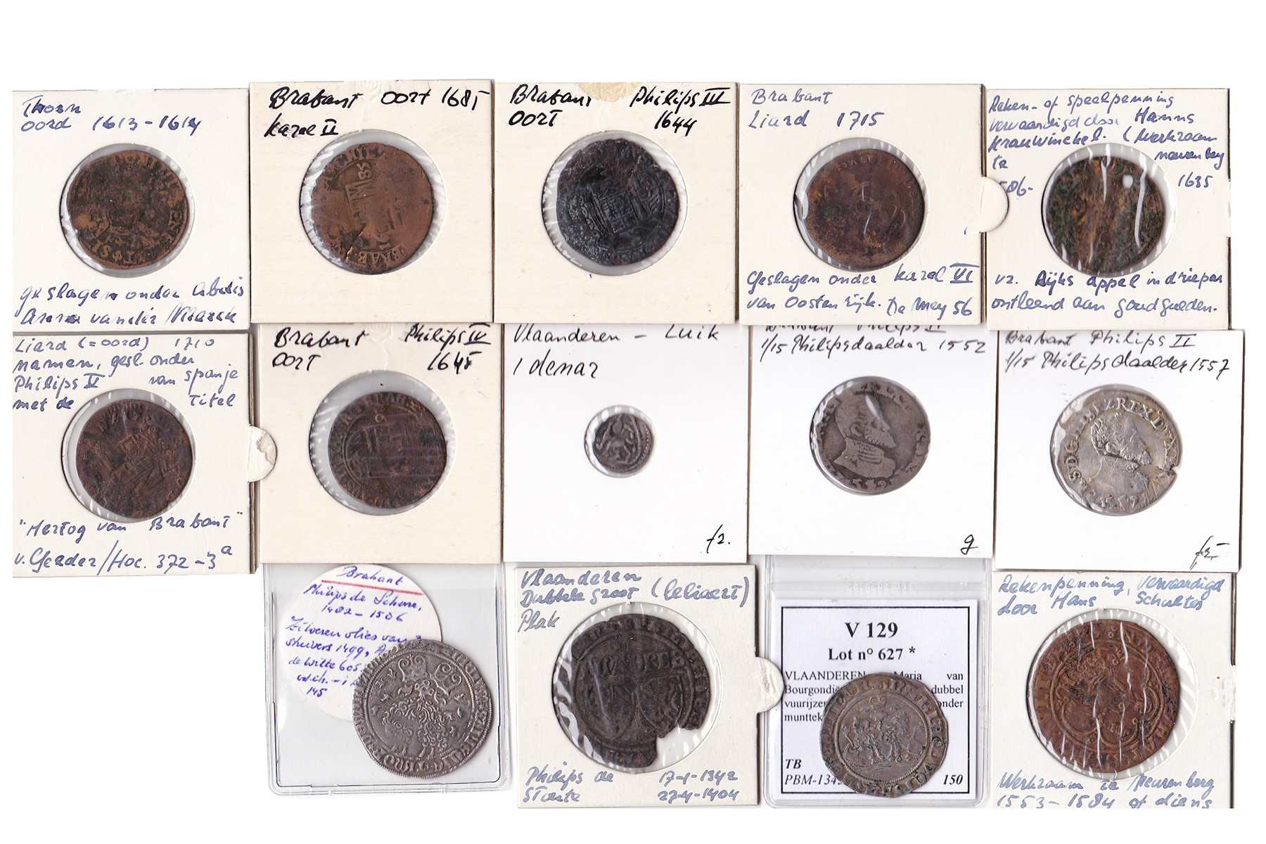 Blikje met 14 stuks voornamelijk Zuidelijke Nederlanden, o.a. Vlaanderen Maria van Bourgondië, Vuurijzer 1478 Brugge, zilveren vlies van 3 stuivers, oord van Thorn.
