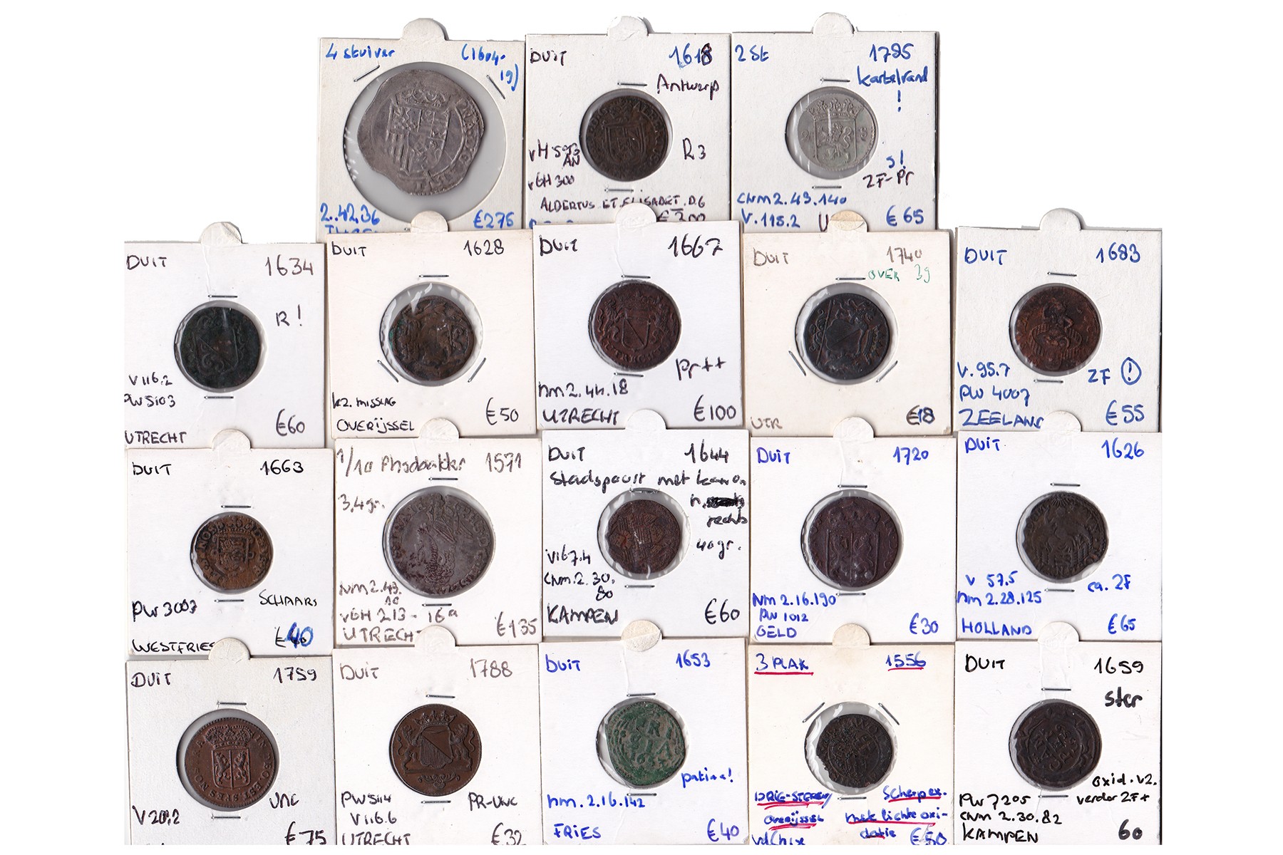 Doosje met 18 stuks divers provinciaal in matige kwaliteit. O.a. duiten, 2 en 4 Stuiver van onder meer Gelderland, Holland, Kampen, Thorn, Overijssel, Utrecht, West-Friesland etc.