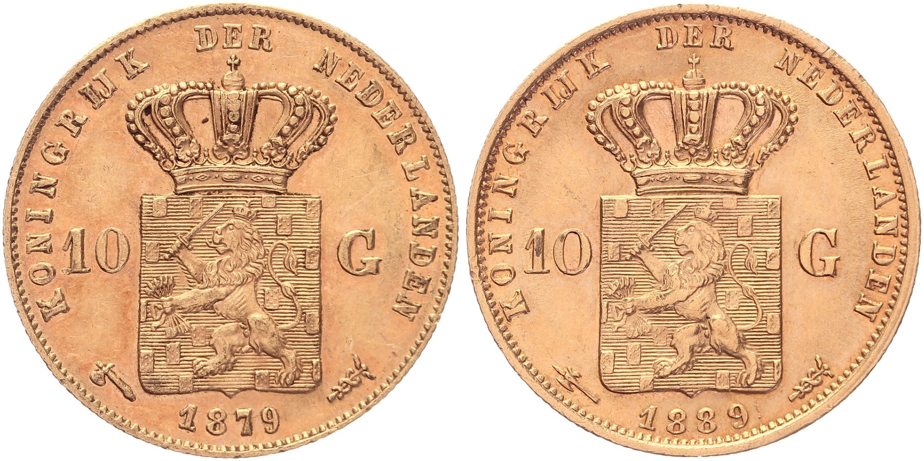Lot (2) 10 Gulden 1879 en 1889 Sch. 552 en 558 Zeer fraai