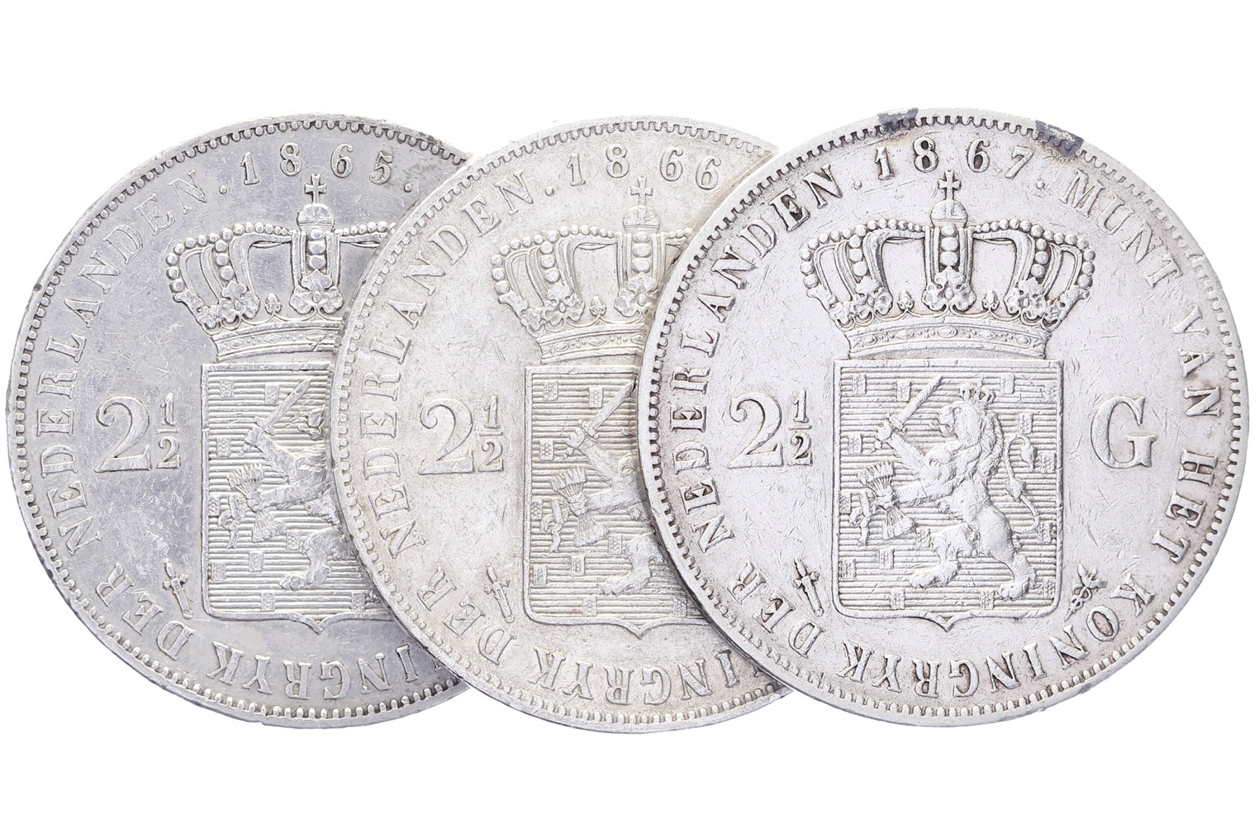 Lot (3) Rijksdaalder 1865, 1866 en 1867 Sch. 591 t/m 593 Vrijwel zeer fraai