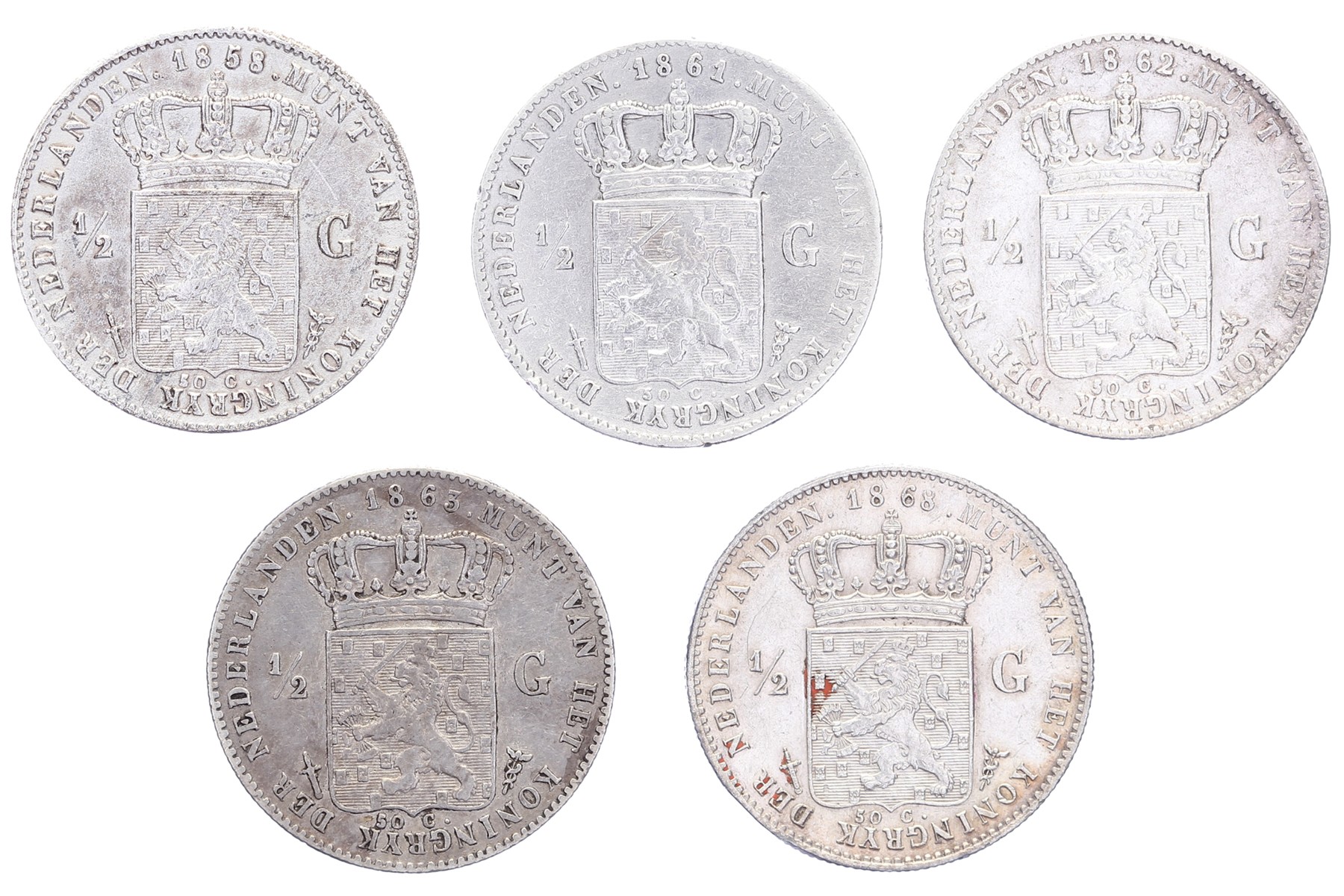 Lot (5) ½ Gulden 1858, 1861, 1862, 1863 en 1868 Sch. 625, 628, 629, 630 en 633 Zeer fraai en beter
