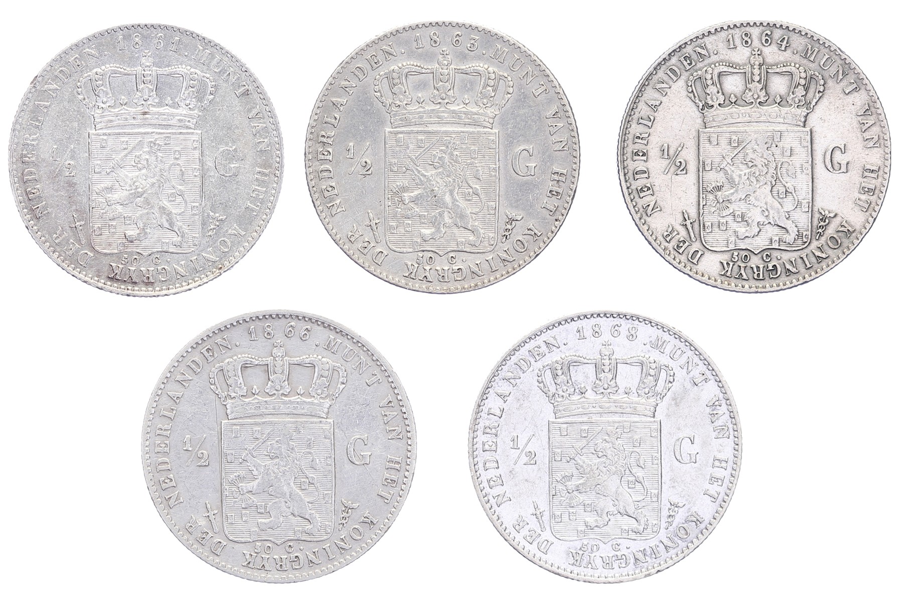 Lot (5) ½ Gulden 1861, 1863, 1864, 1866 en 1868 Sch. 628, 630 t/m 633 Zeer fraai en beter