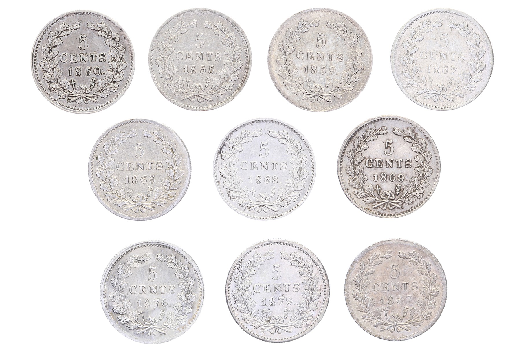 Lot (10) 5 Cents 1850-1887. Complete serie op 1853 na! Sch. 666, 668 t/m 676 Prachtig en beter!