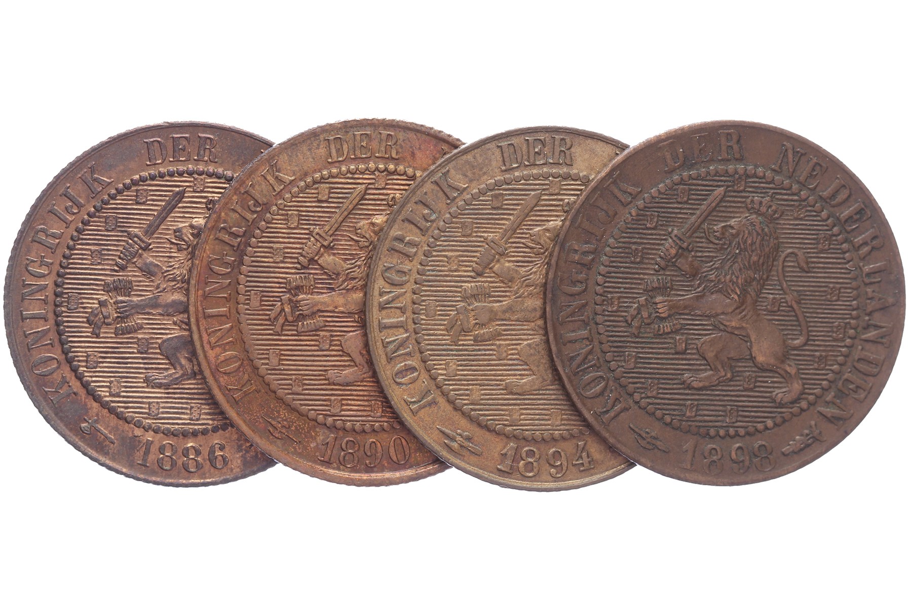 Lot (4) 2 ½ Cent 1886, 1890, 1894 en 1898 Sch. 684, 947, 948 en 949. Deels originele kleur! Prachtig / FDC