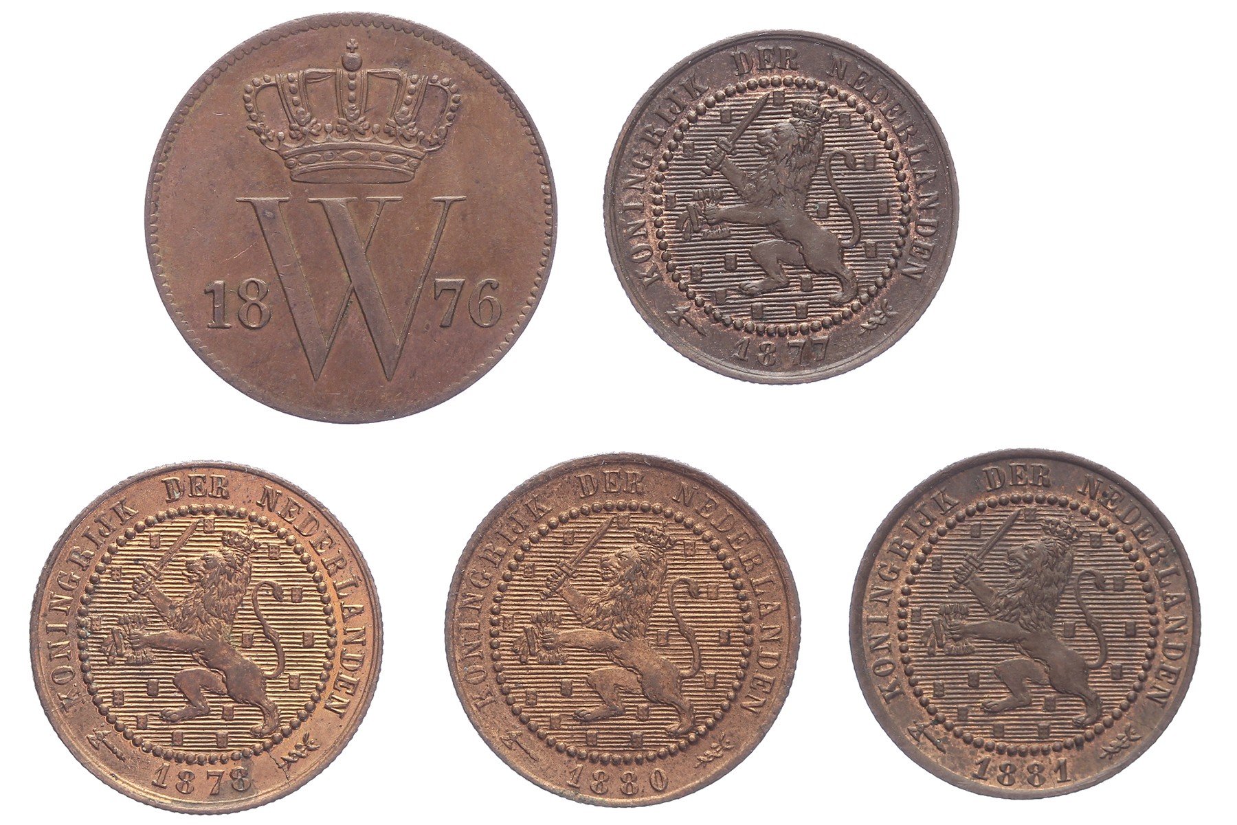 Lot (5) 1 Cent 1876, 1877, 1878, 1880 en 1881 Sch. 693, 695, 696 t/m 698. Originele kleur Prachtig / FDC