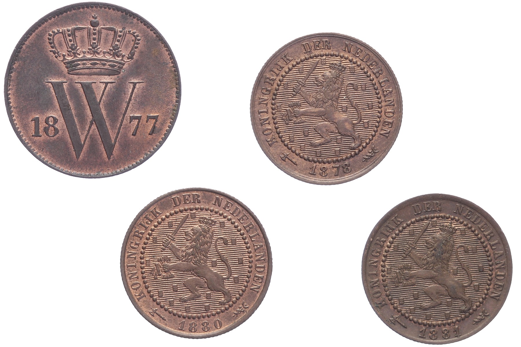 Lot (4) 1 Cent 1877, 1878, 1880 en 1881 Sch. 694, 696 t/m 698. Deels originele kleur Prachtig / FDC