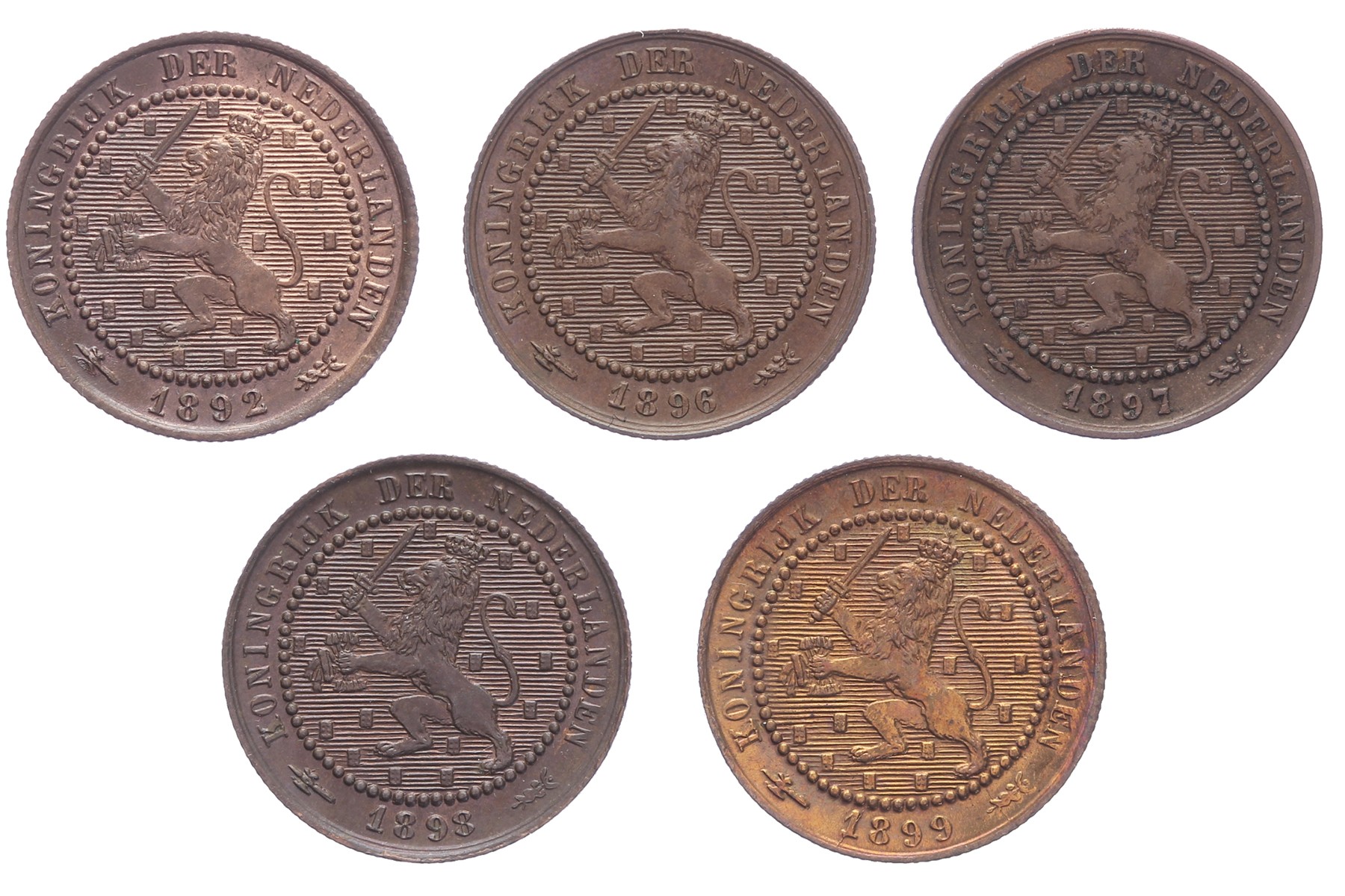 Lot (5) 1 Cent 1892, 1896, 1897, 1898 en 1899 Sch. 963 t/m 967. Deels originele kleur. Complete serie Prachtig / FDC