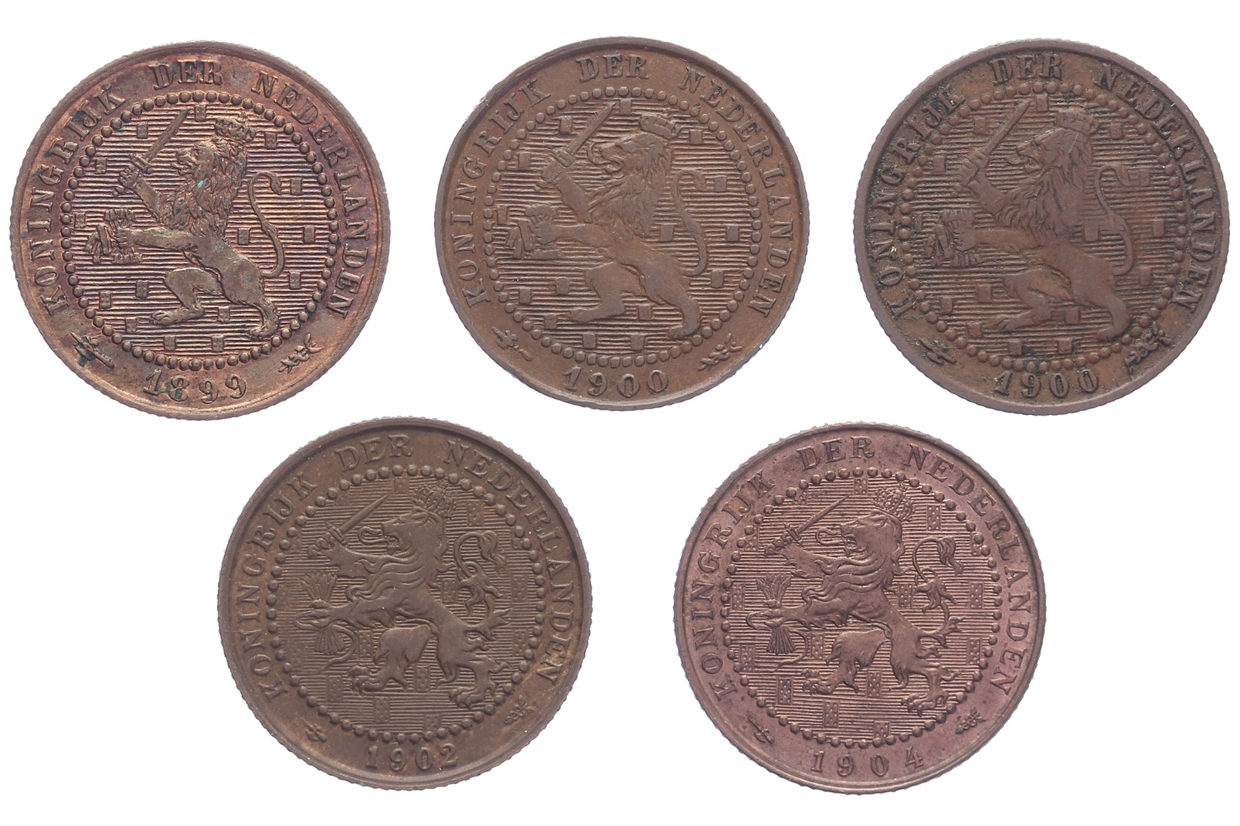 Lot (5) 1 Cent 1899, 1900 (2), 1902 en 1904 Sch. 967, 968a+b, 971 en 972. Deels originele kleur Prachtig / FDC