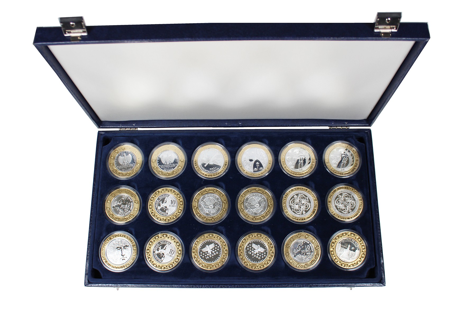 Blauwe cassette met 44 stuks uit de zilveren euro-collectie, bestaande uit o.a. 5 (16) en 10 (20) euro herdenkingsuitgiften.