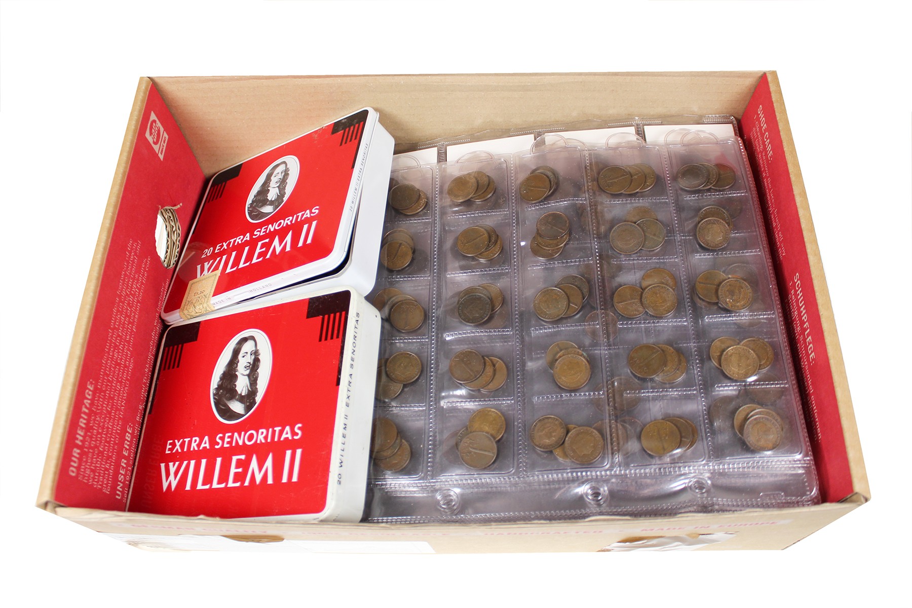 Doos met Importa-bladen en sigarenblikjes gevuld met oud nominaal guldengeld. Alsmede o.a. 6 x €5 en 2 x €10.