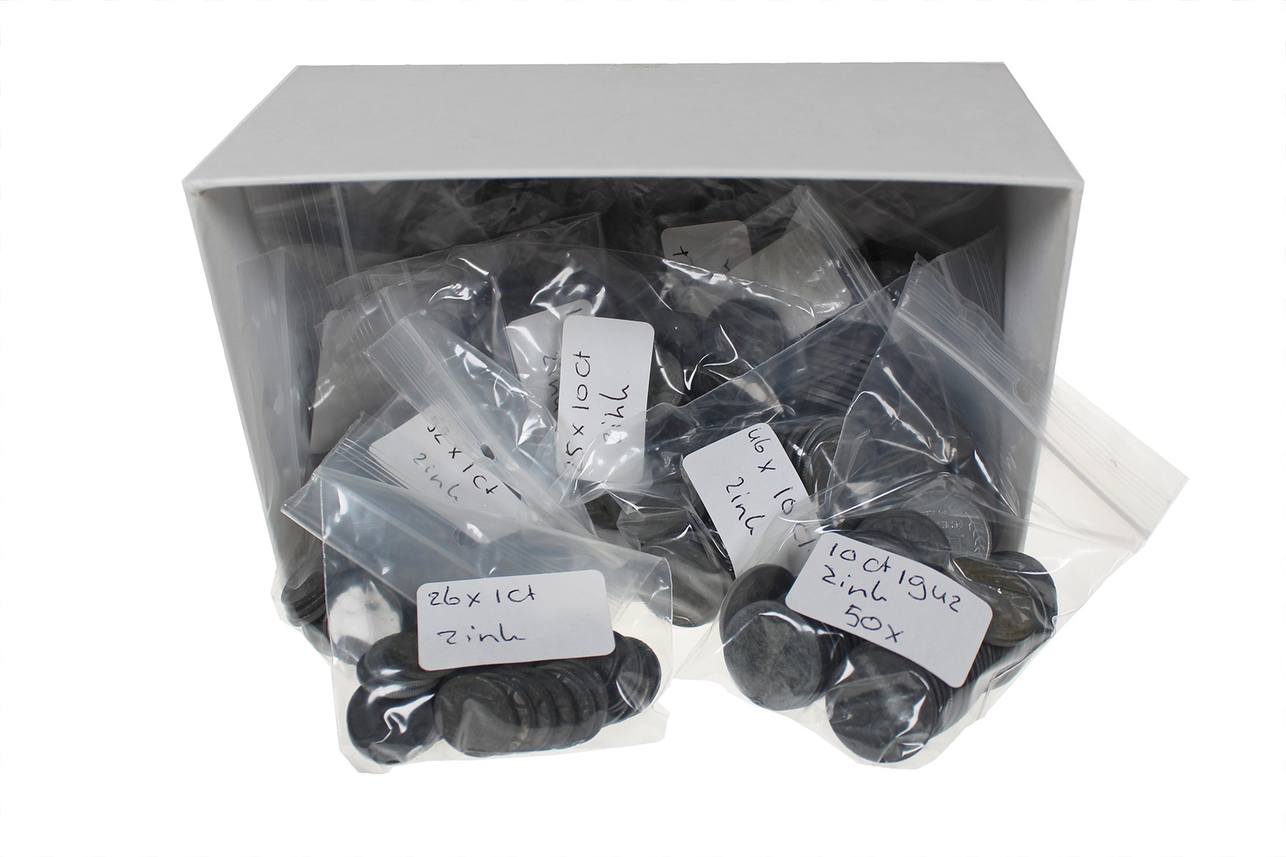 Doos met groot aantal zinken oorlogsmunten, 2 ½ cent t/m 25 cents. Aantallen op zakjes in lot!