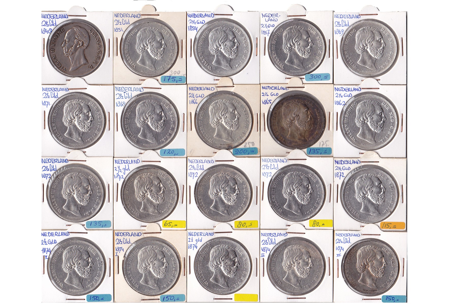 Doos met 20 stuks rijksdaalders Willem II en Willem III in redelijke kwaliteit. Fraai / Zeer fraai.