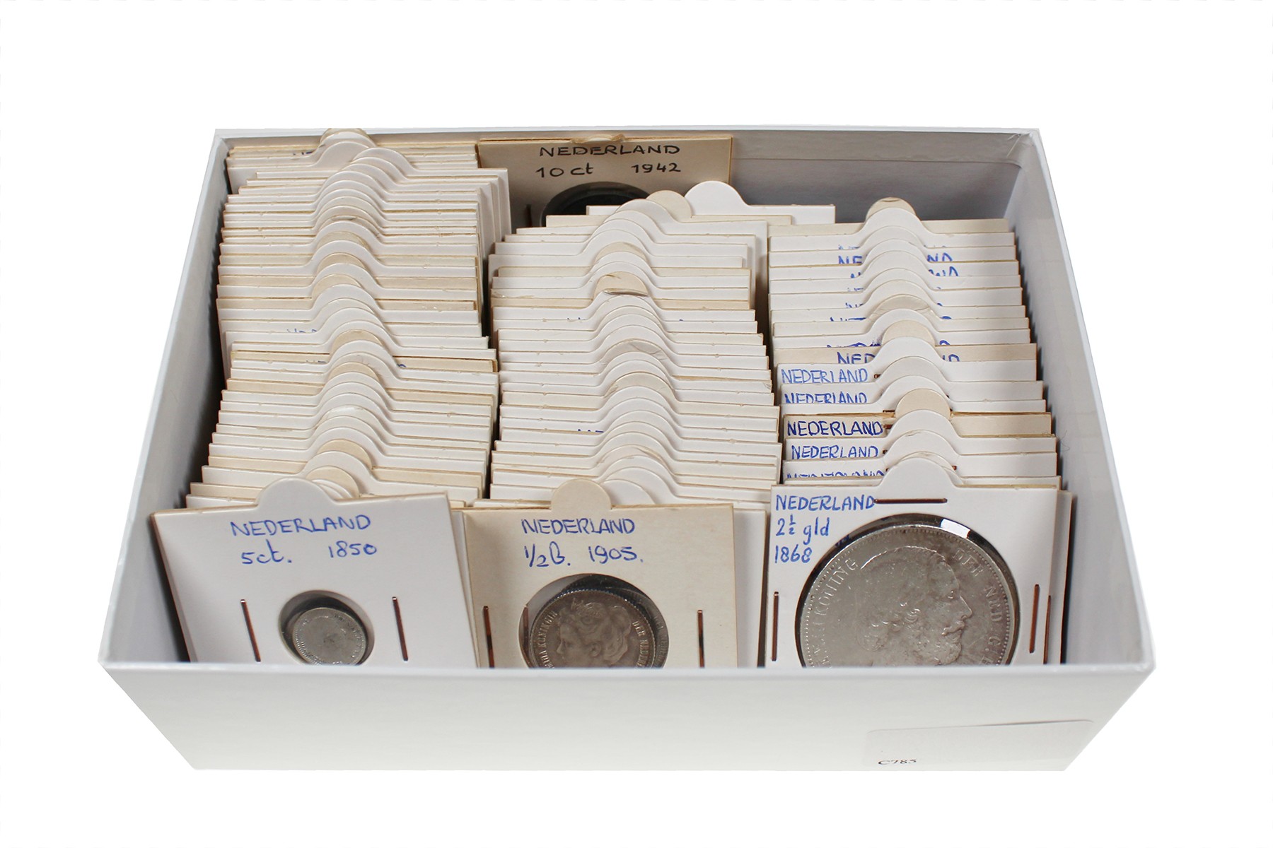 Doos met oude handelsvoorraad bestaande uit 10 x ½ cent, 10 x 2½ cents, 10 x 5 cents, 10 x 25 cents, 10 x ½ gulden, 10 x gulden en 10 x rijksdaalder. Willekeurig van samenstelling Willem III en Wilhelmina. Geen dubbele! Mooie kwaliteit!