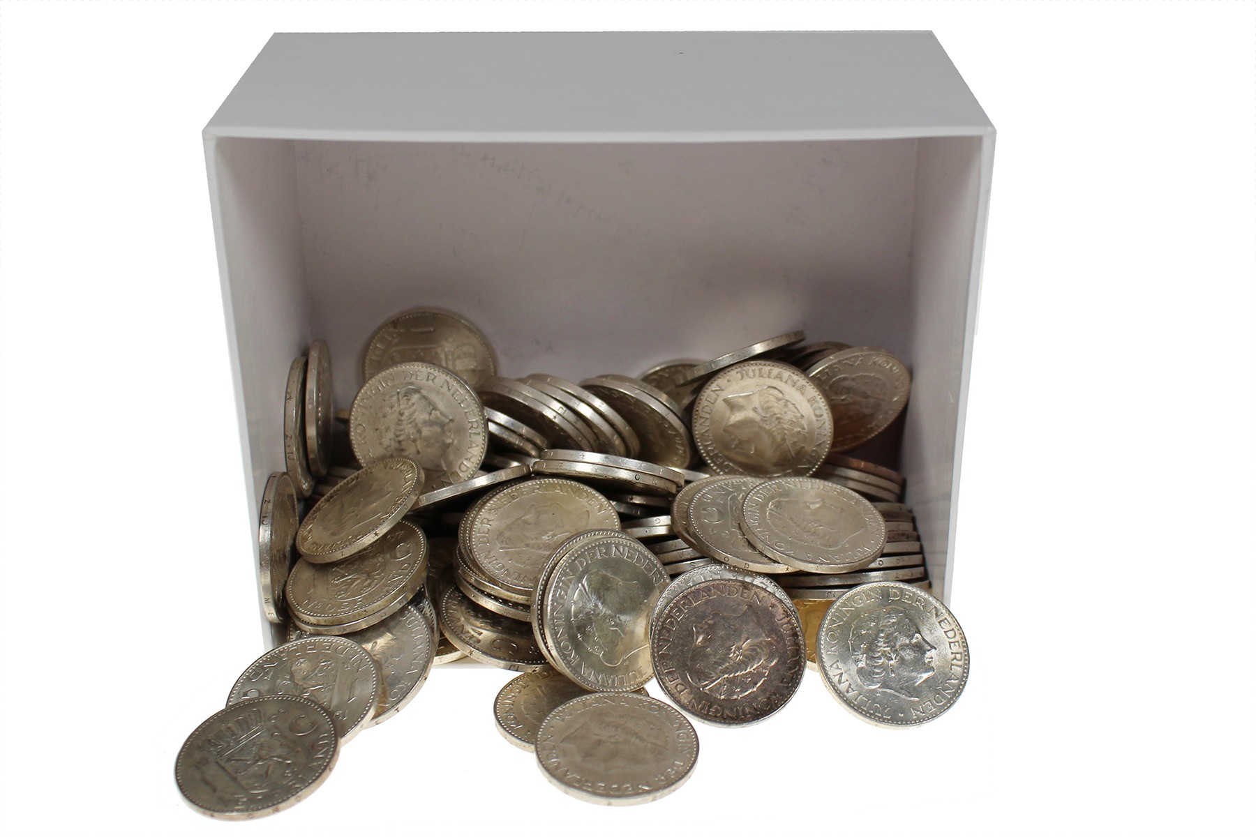Doosje met 100 stuks topkwaliteit Juliana-guldens, type 1954-1967. Als ik deze munten een gradering zou moeten toekennen, begint het met KDG60, met uitschieters naar KDG65!