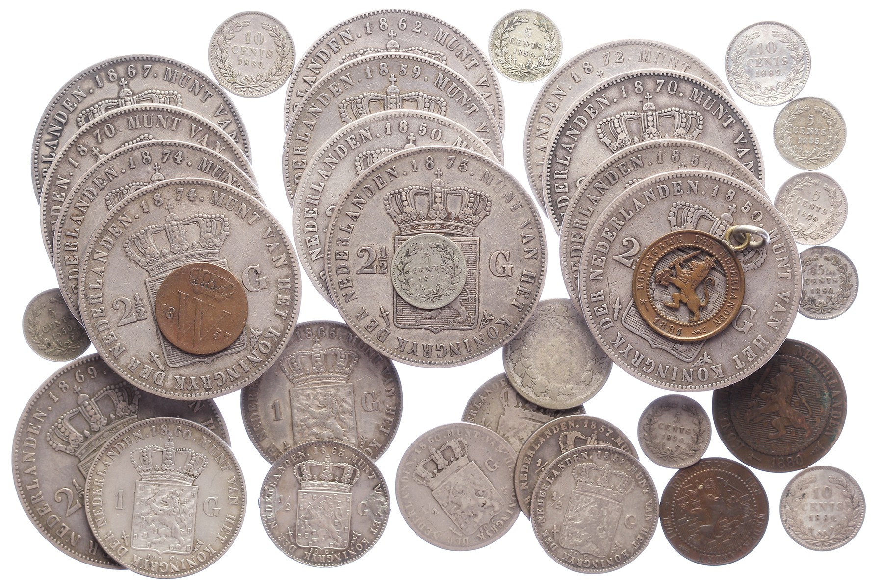 Doosje met leuk lot Willem III onuitgezocht, ca. 30 stuks! Ondermeer 12 stuks rijksdaalders!