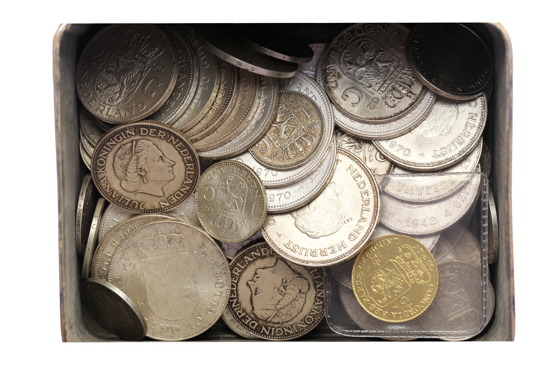 Blikje met munten uit het Juliana-tijdperk 1948-1980, o.a. 23 x 10 gulden 1970-1973, 8 x rijksdaalder 1959-1966, 17 zilveren guldens. Toegevoegd: 14 gulden of gouden rijder 1750, naslag uit 1959.