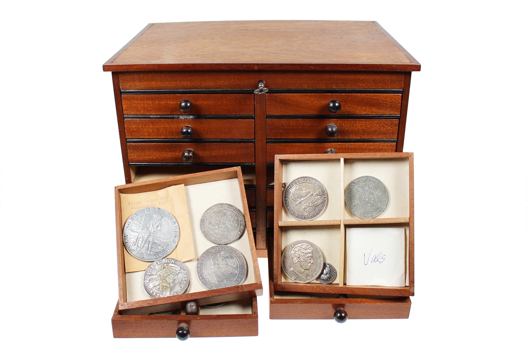 Charmant houten munten- of penningkastje met twee rijen à 7 laatjes en afsluitbare bovenlade. Gevuld met eenvoudige wereldmunten, enkele penningen en krantenartikelen, alsmede enige vervalsingen.H X B X L = 21 x 22 x 27,5 cm.