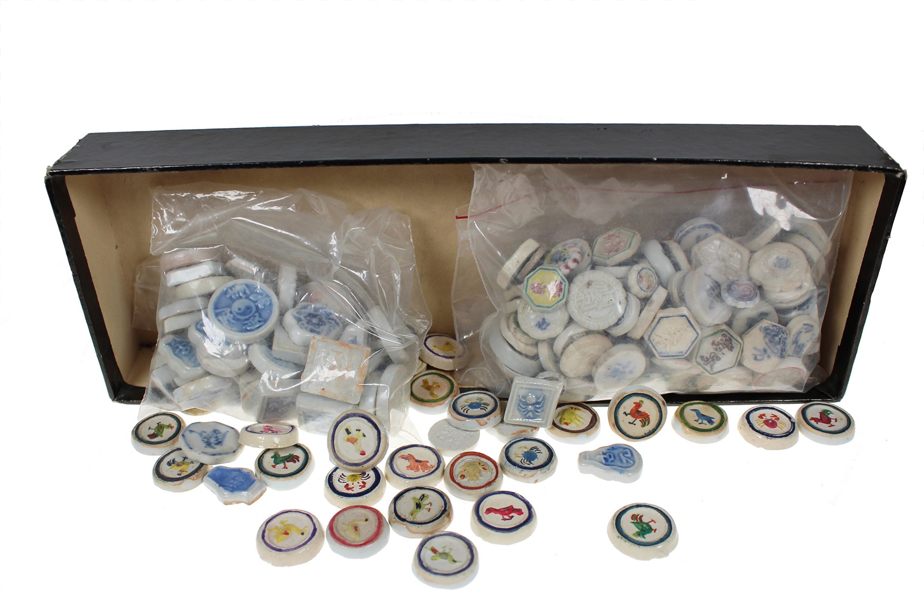 Langwerpige doos met groot aantal (!) Chinees theegeld. Allen porselein. Leuk!!