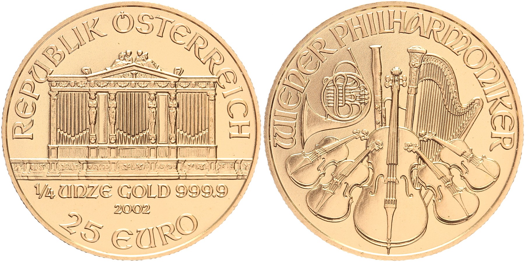 25 Euro 2002 Philharmoniker. ¼ ounce goud. KM. 3093. UNC.