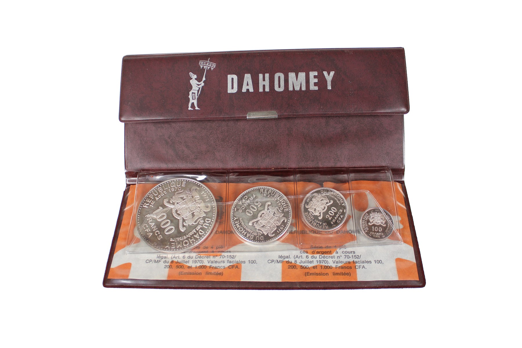 Lot (4) 100, 200, 500, 1000 Francs CFA 1971, 10th Anniversary of Independence.KM 1.3; 2.2; 3.1; 4.1. In original etui. Proof.