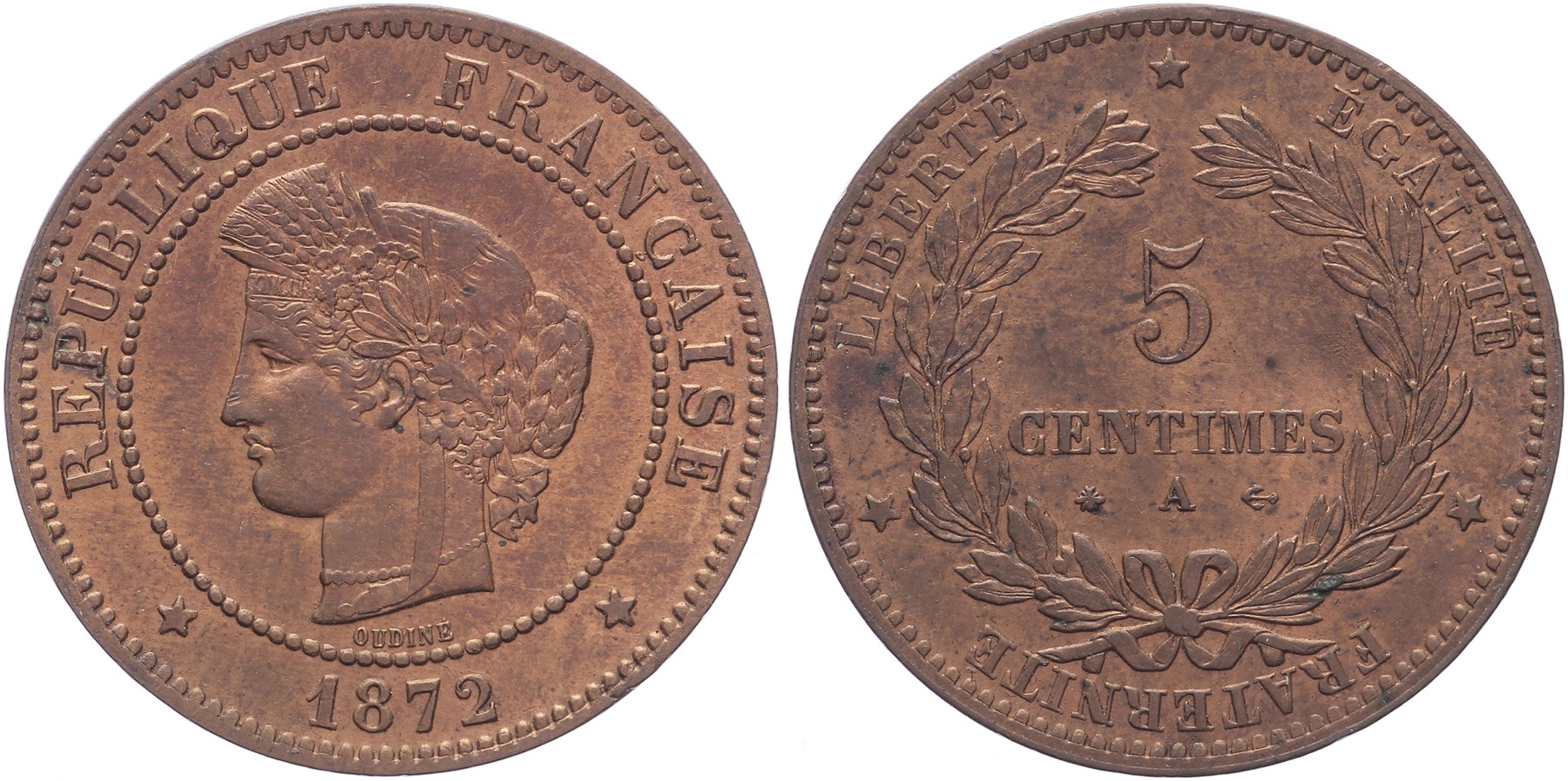 5 Centimes 1872 A. Small A. KM 821.1. UNC.